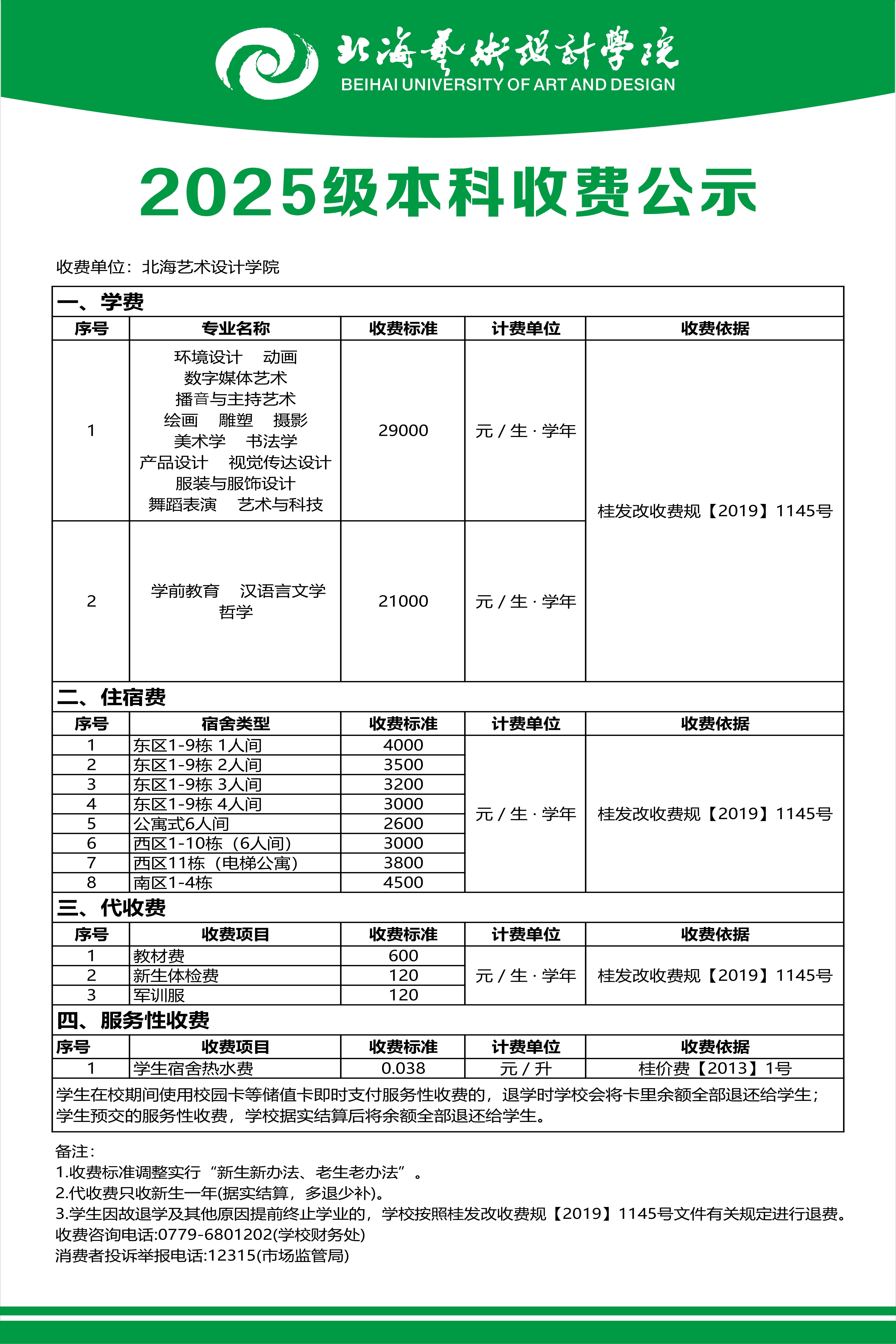 北海艺术设计学院南校区学生宿舍楼收费标准公示