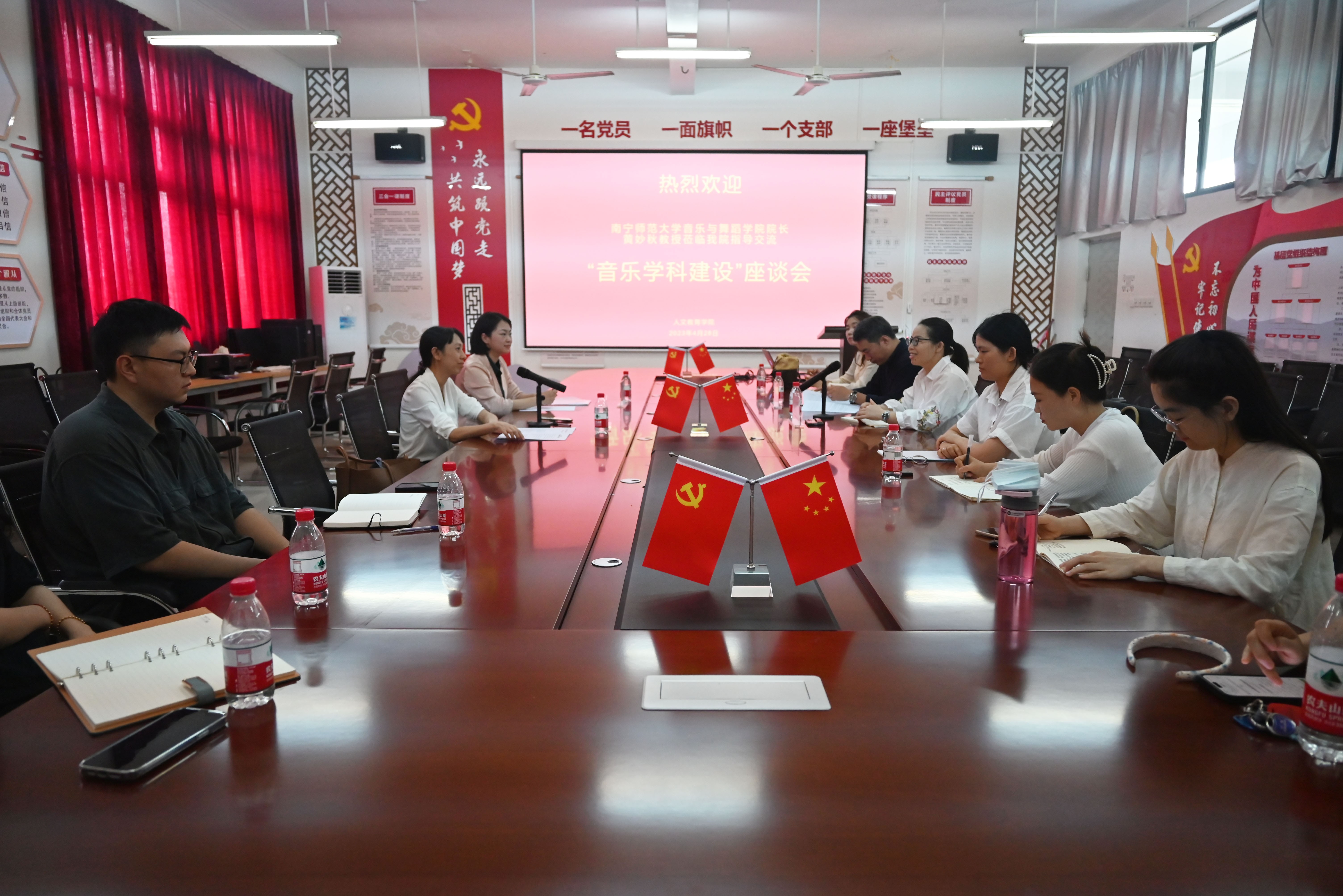 4月28日下午,在“音乐学科建设”座谈会上,黄院长热情慷慨地分享了南宁师范大学音乐与舞蹈学院的发展历史、学院概况、专业建设、师资队伍、课程建设、学生就业及学院未来的发展方向,详细介绍了学科专业人才培养计划、南宁师范大学校办学理念及民族教育办学特色。人文教育学院熊秀峰院长、李谦副院长出席座谈会并与黄院长进行了深入友好的交流探讨。座谈会由艺术教育教研室孙嘉昕主任主持。