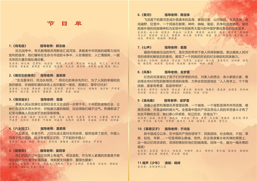 最后在歌曲《少年》中拉下帷幕,“少年强则国强”,作为新时代的接班人我们要牢记使命,铭记中国共产党艰苦卓绝的奋斗历程,感悟共产党人的初心与使命。