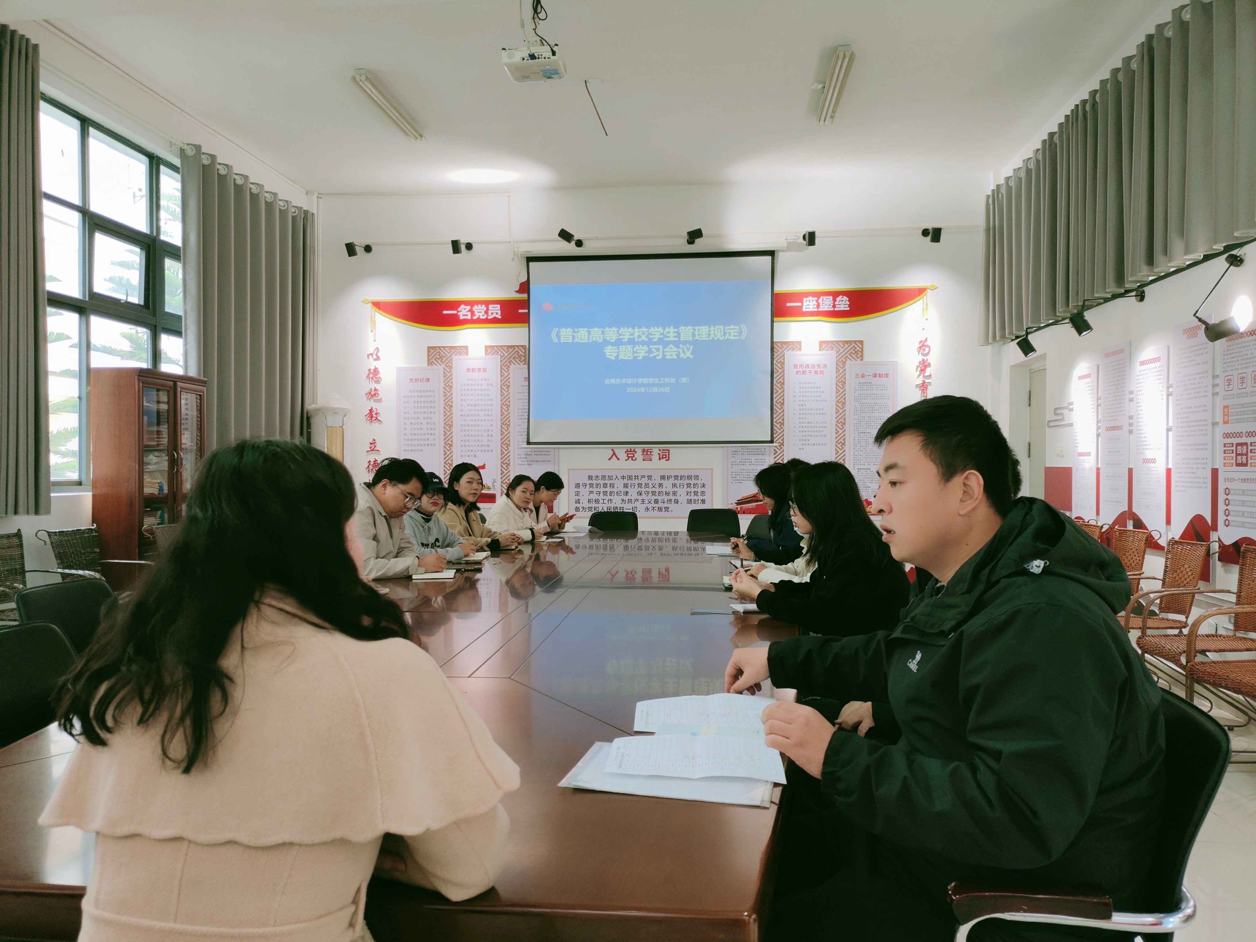 20241226日,北海艺术设计学院学工处在西区学工楼204举行了专题学习活动,活动主题包括:学习教育部第41号令和“时代楷模”杨士莪先进事迹。学工处全员积极参与,为学校学生管理工作增添新动力,收获满满。