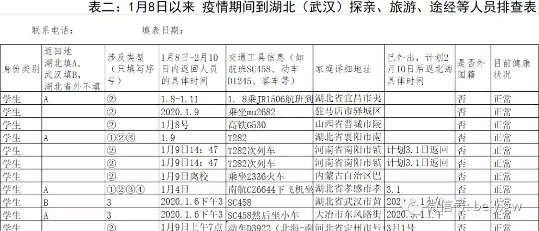 学工处第一时间对全校学生进行全覆盖健康状况摸排统计,由班主任对全班在疫情期间到湖北(武汉)探亲、旅游、途经等学生进行全面摸排统计,共掌握418名有经过湖北或有过湖北接触史的学生,为每位学生建立健康台账。