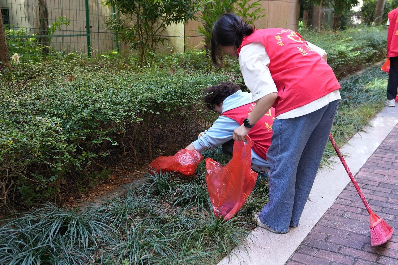 各班级团支部的同学们迅速分组。有的小组负责清扫社区道路,确保路面干净整洁;有的小组负责则深入绿化带,仔细捡拾垃圾。