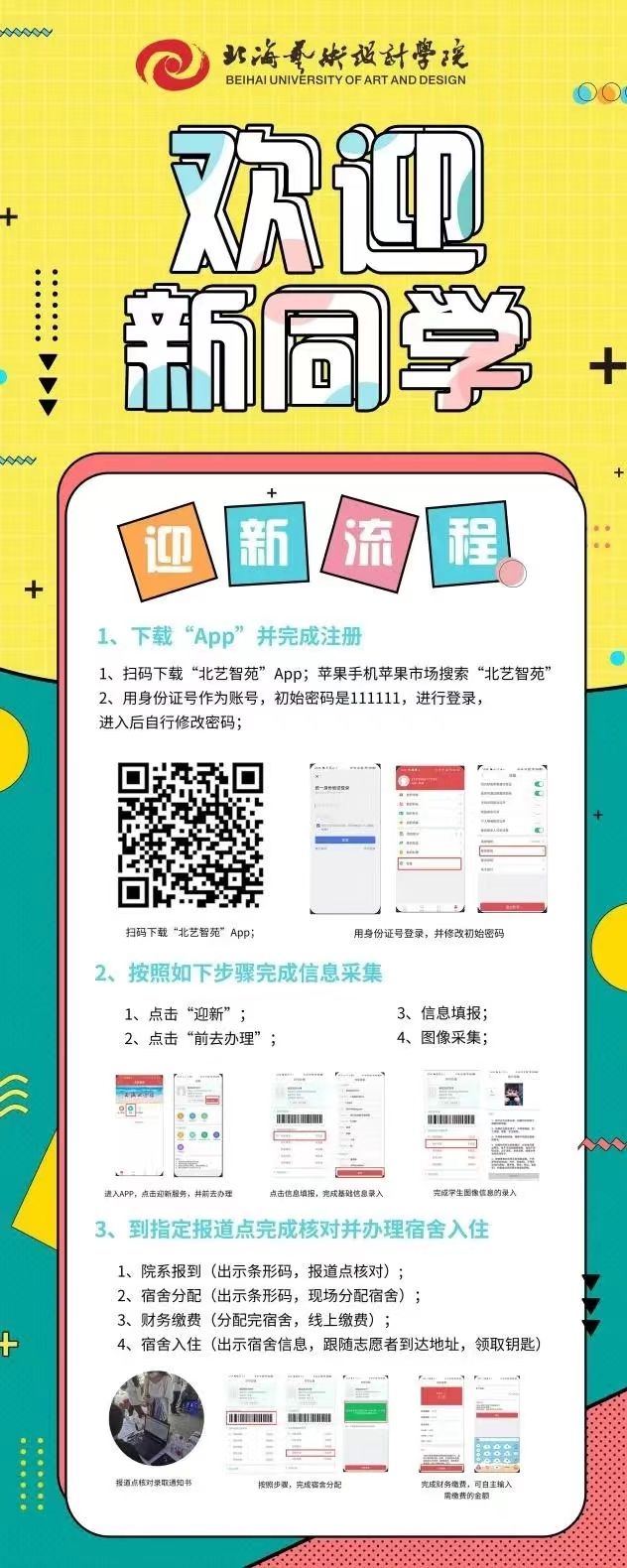 噔噔噔,为了提高入学效率,学校特地开发了名为“北艺智苑”的APP,学弟学妹们可以自行下载,在里面完成信息录入、缴纳费用等流程。
