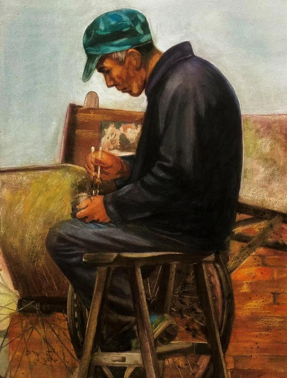 杨圆缘《进城的农民工》  52cm×52cm 2023年 纸本水彩