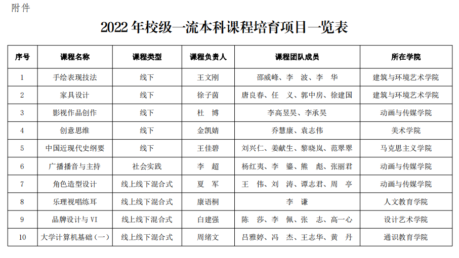 根据《关于组织开展 2022 年校级一流本科课程培育项目申报工作的通知》(北艺教务〔2022〕106 号)要求,教务处认真组织开展了2022 年校级一流本科课程培育项目申报、立项工作。经各二级学院遴选推荐、教务处资格审核及校内外专家评审,拟认定《手绘表现技法》等 10 门课程为校级一流本科课程培育项目。现将认定结果予以公示,具体名单见附件。公示期自 2023 年 3 月 6 日至 3 月 10 日,共 5 工作日。公示期内,如对认定结果有异议,请以书面形式或电话形式向教务处反映,逾期不再受理。书面形式须署真实姓名交至教务处行政楼 324 办公室,联系电话:13877929312。