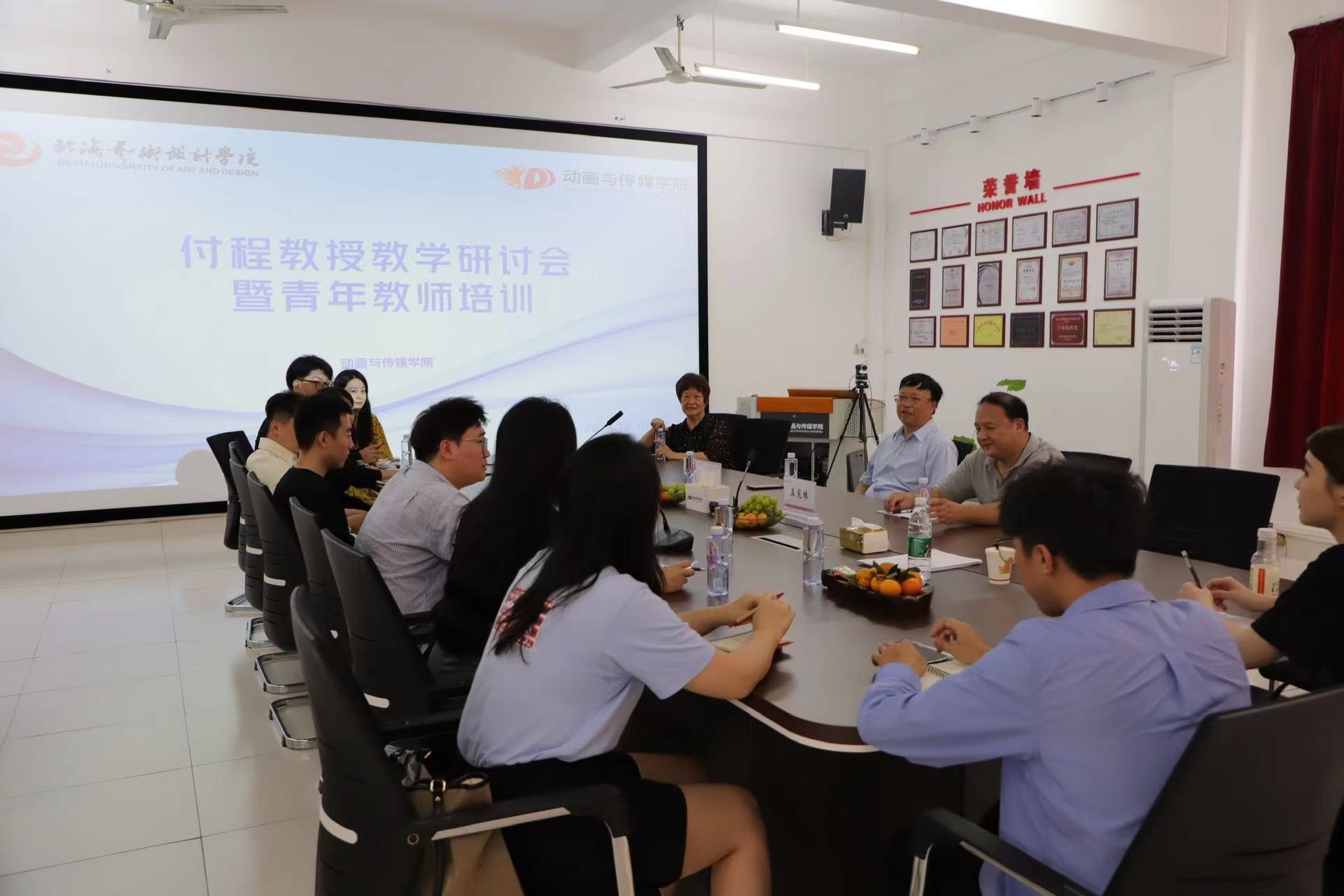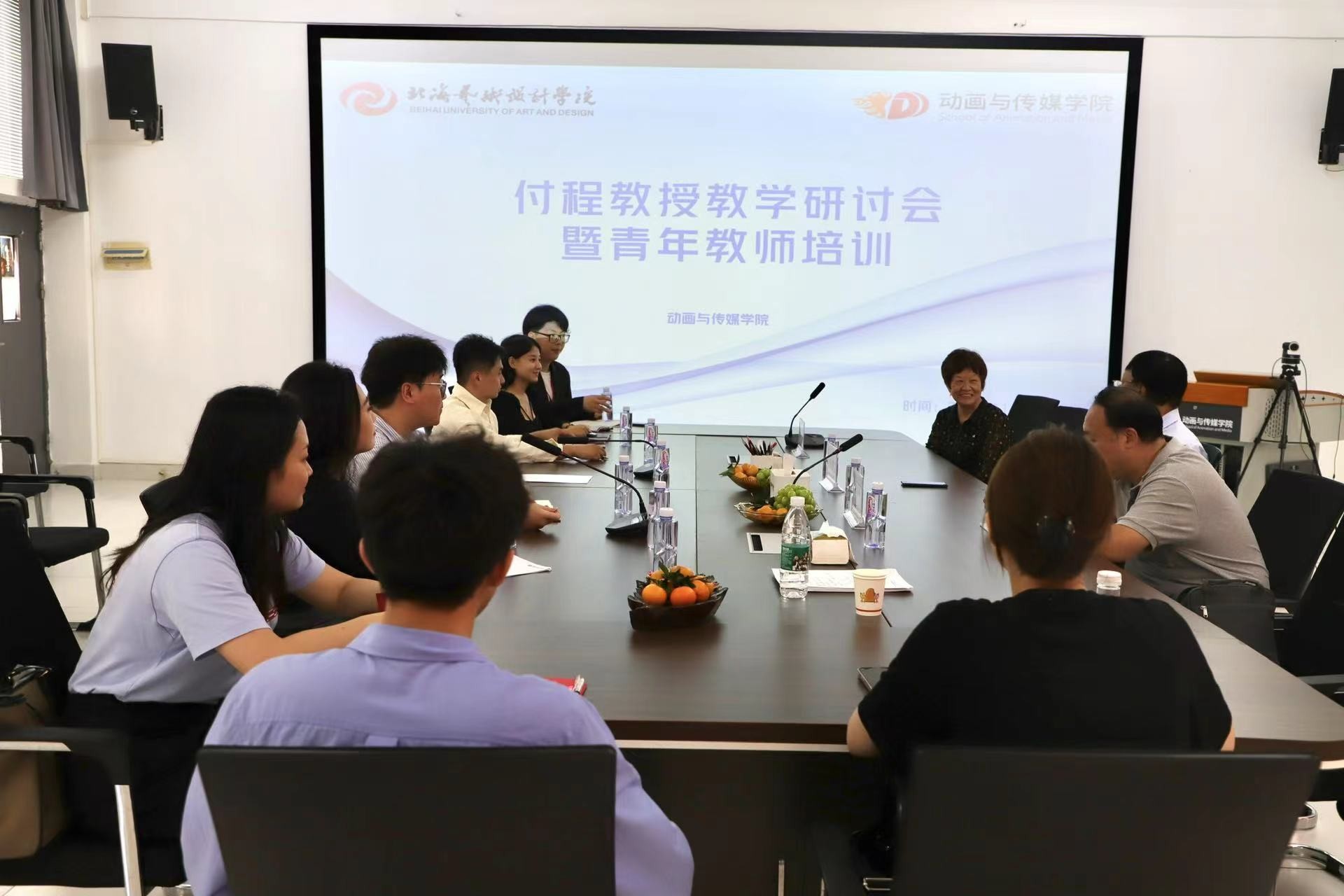 为进一步提升播音与主持艺术专业的内涵建设及教师科研能力和水平, 11月10日下午,播音与主持艺术教研室成功召开了教学研讨会暨青年教师培训会,中国传媒大学付程教授莅临指导,南宁师范大学孟宪林教授、动画与传媒学院副院长杨红夷应邀出席,播音与主持艺术专业教师参加。