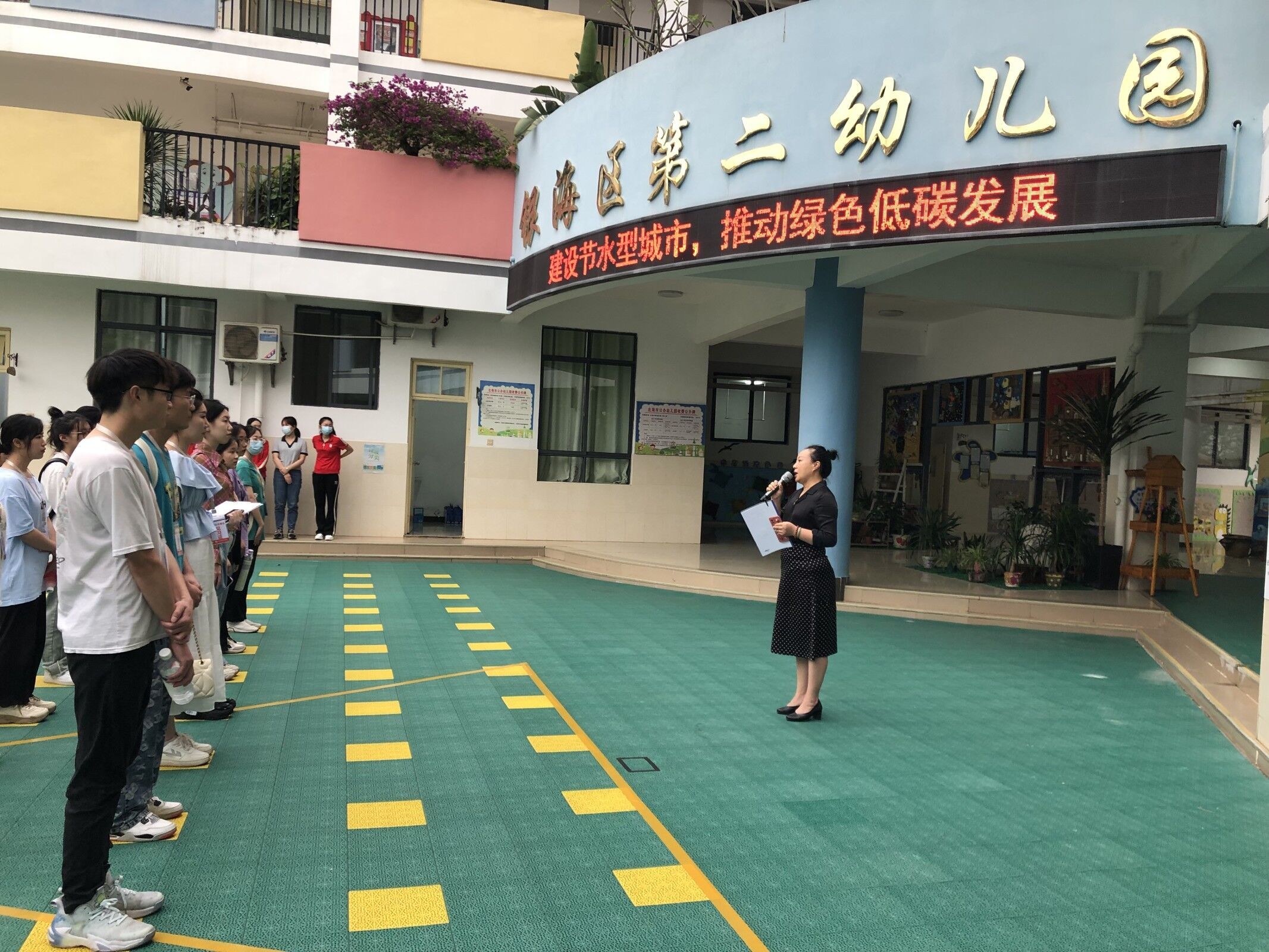 银海区第二幼儿园园长给见习生们介绍幼儿园情况