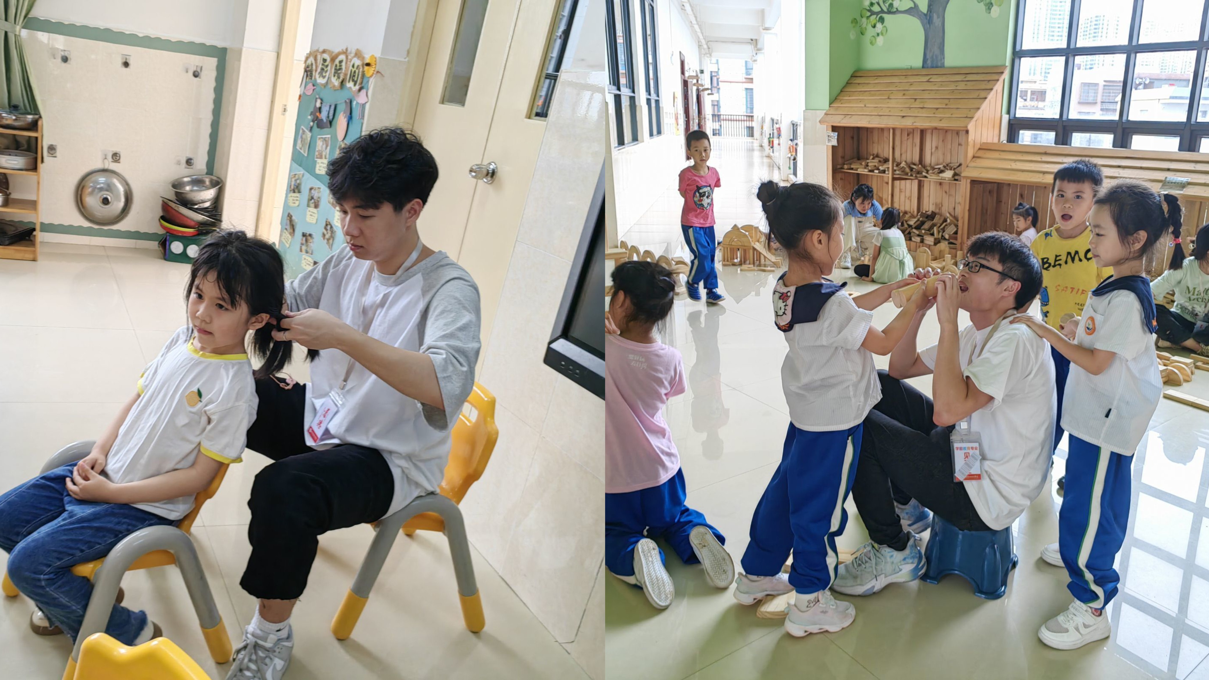 见习生给幼儿梳头发                     见习生与幼儿游戏