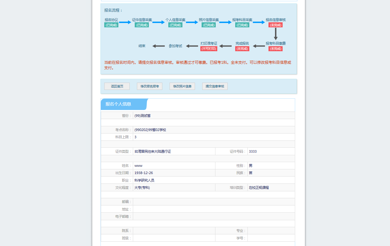 2.支付成功后报名流程完成,考生不能修改个人信息、科目信息或退考退费。