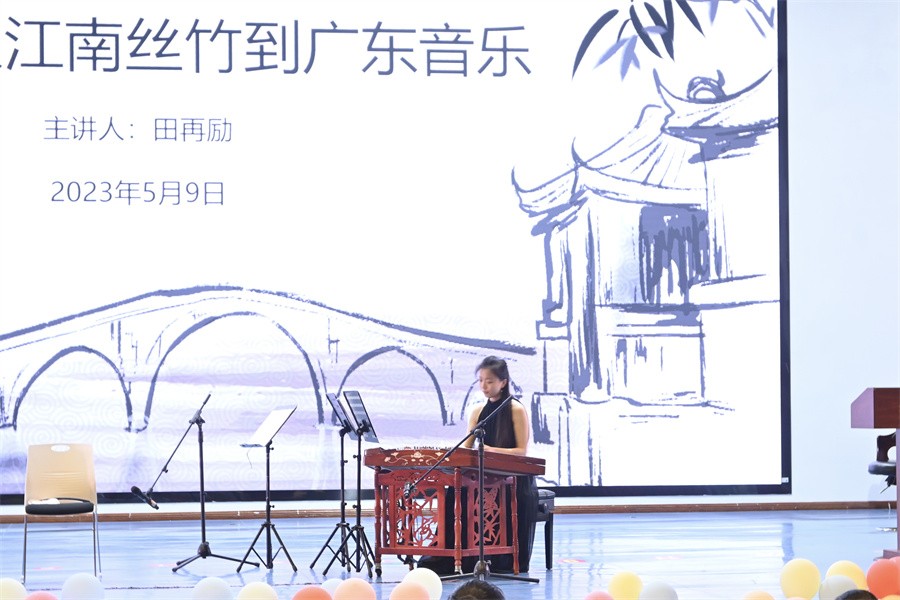 随着一曲耳熟能详的《步步高》响起,田教授现场展示了广东音乐的主奏乐器——高胡的艺术魅力。紧接着,江南丝竹八大代表作之一——《行街》细腻婉转的音响又飘进每位在场观众耳中。田教授结合现场演奏,详细讲解了广东音乐和江南丝竹的演奏形式、代表人物与代表作品。讲座妙趣横生、气氛热烈,受到了师生们的高度欢迎,加深了师生对江南丝竹、广东音乐等中国传统民族器乐音乐的认识,点燃了师生对二胡、高胡艺术的浓厚兴趣。