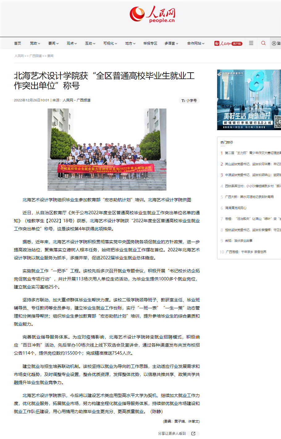 人民网:北海艺术设计学院获“全区普通高校毕业生就业工作突出单位”称号