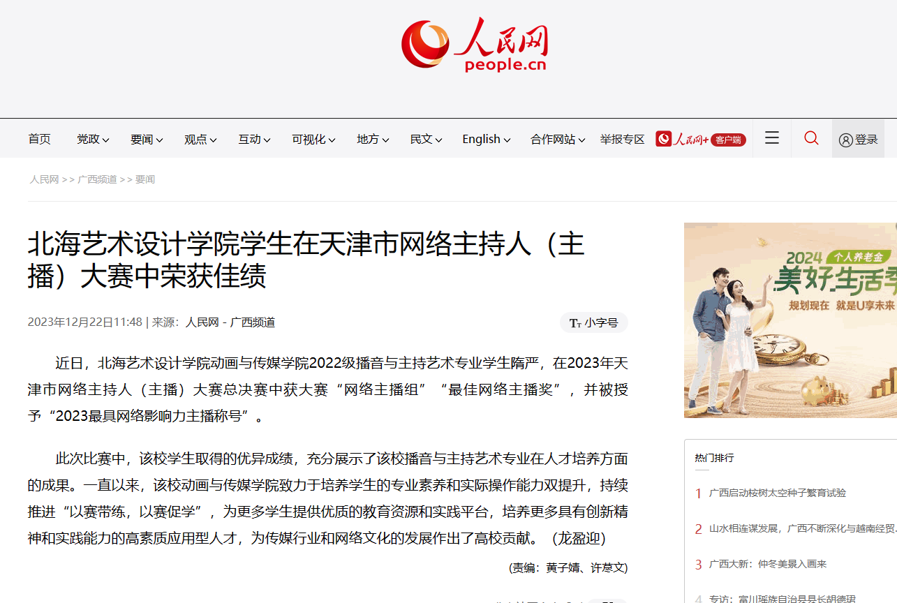 人民网:北海艺术设计学院学生在天津市网络主持人(主播)大赛中荣获佳绩