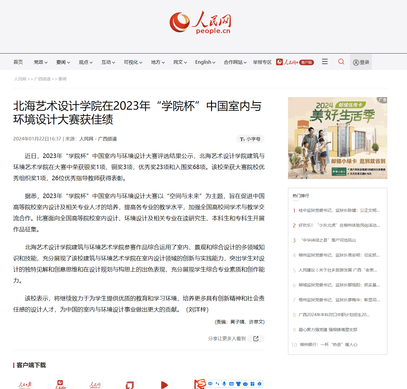 人民网:北海艺术设计学院在2023年“学院杯”中国室内与环境设计大赛获佳绩