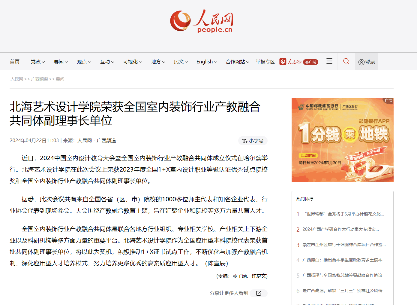 人民网:北海艺术设计学院荣获全国室内装饰行业产教融合共同体副理事长单位