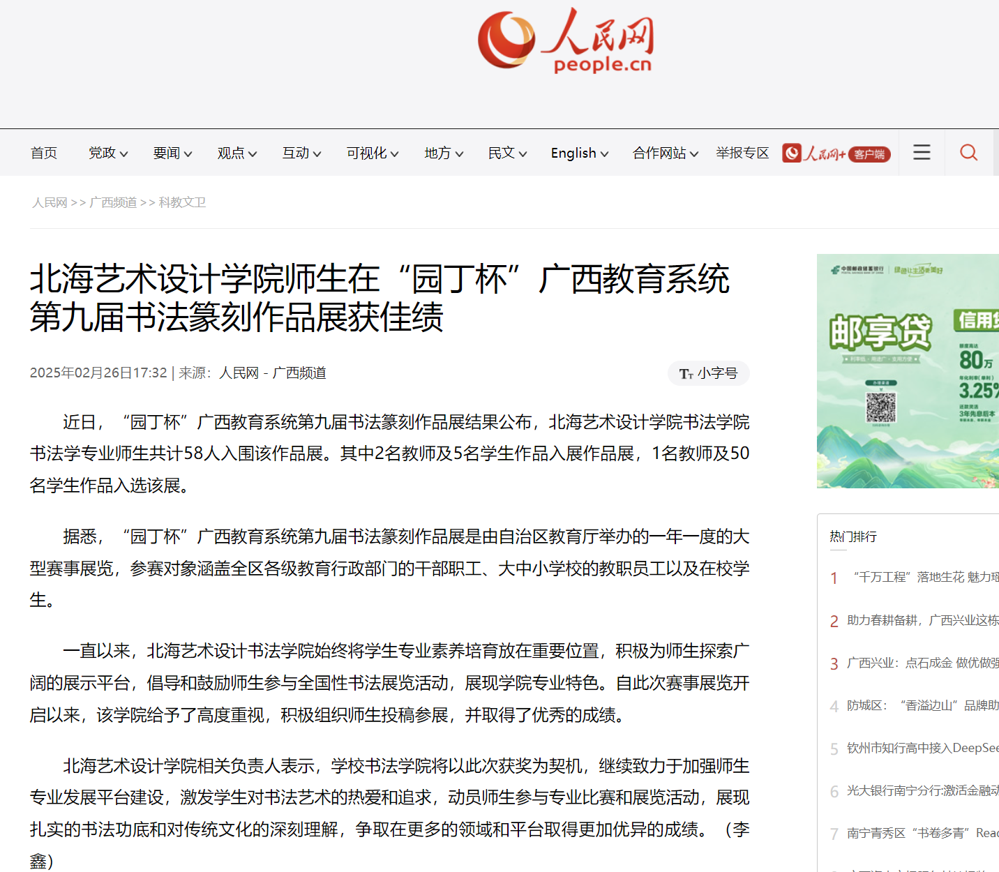 人民网:北海艺术设计学院师生在“园丁杯”广西教育系统第九届书法篆刻作品展获佳绩