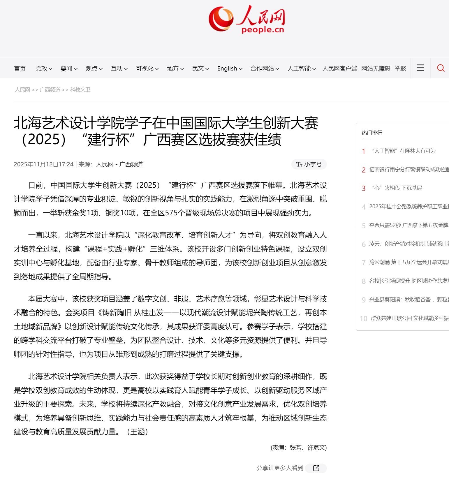 人民网:北海艺术设计学院学子在中国国际大学生创新大赛(2025)“建行杯”广西赛区选拔赛获佳绩
