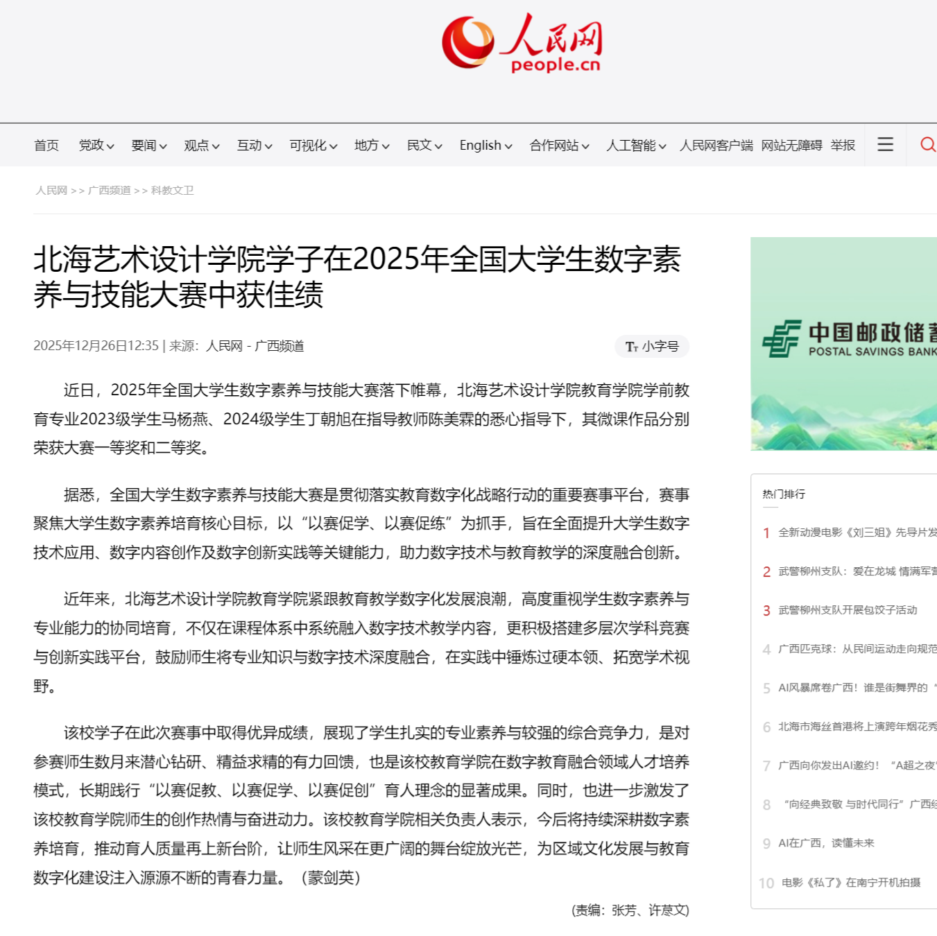 人民网:北海艺术设计学院学子在2025年全国大学生数字素养与技能大赛中获佳绩