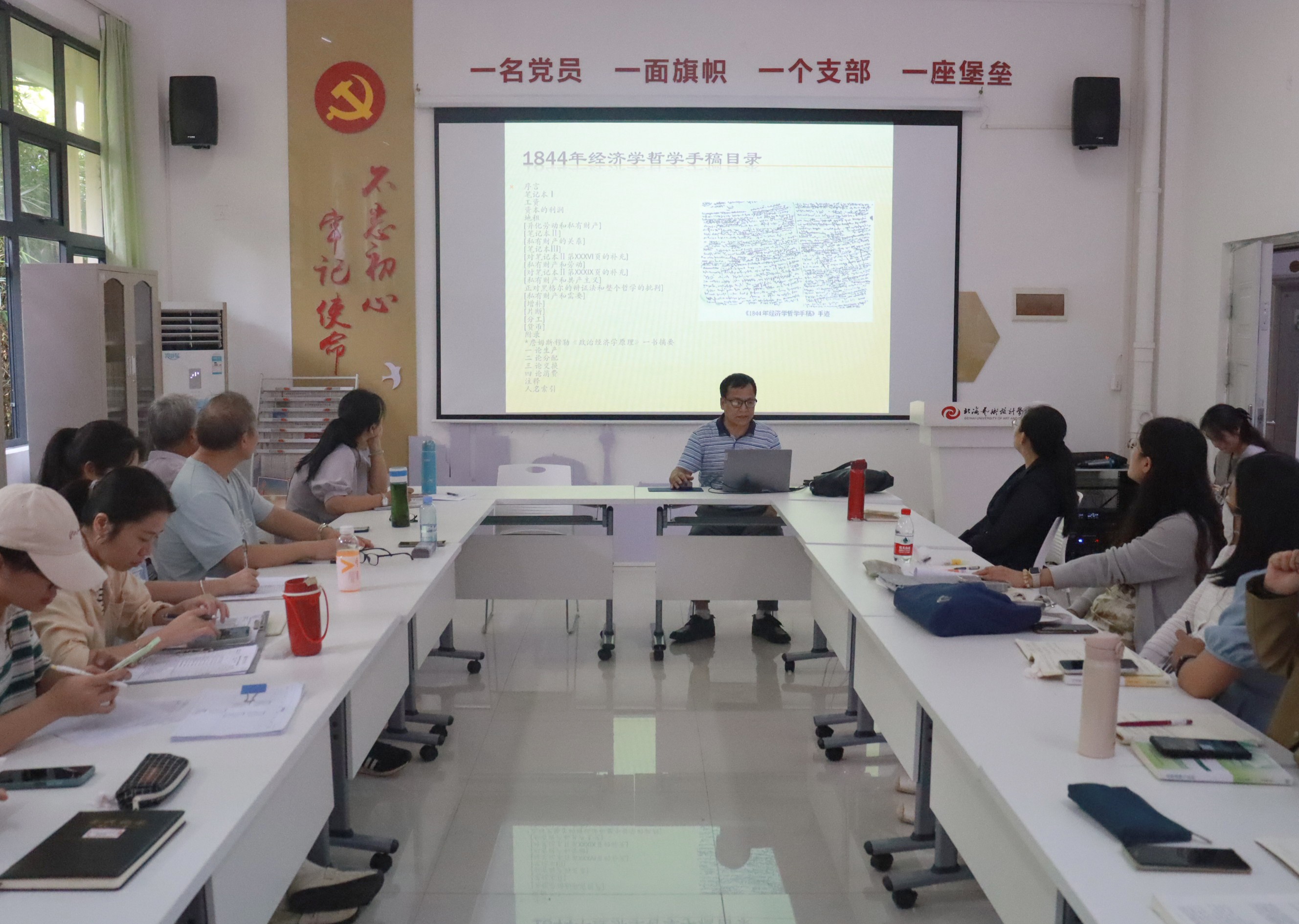 10月11日下午15:30,马克思主义经典著作导读系列活动第三讲在西校区行政楼103如约而至,由韦正球副教授主讲《1844年经济学哲学手稿》,我院副院长罗秋梅主持,学院全体中青年教师参加。