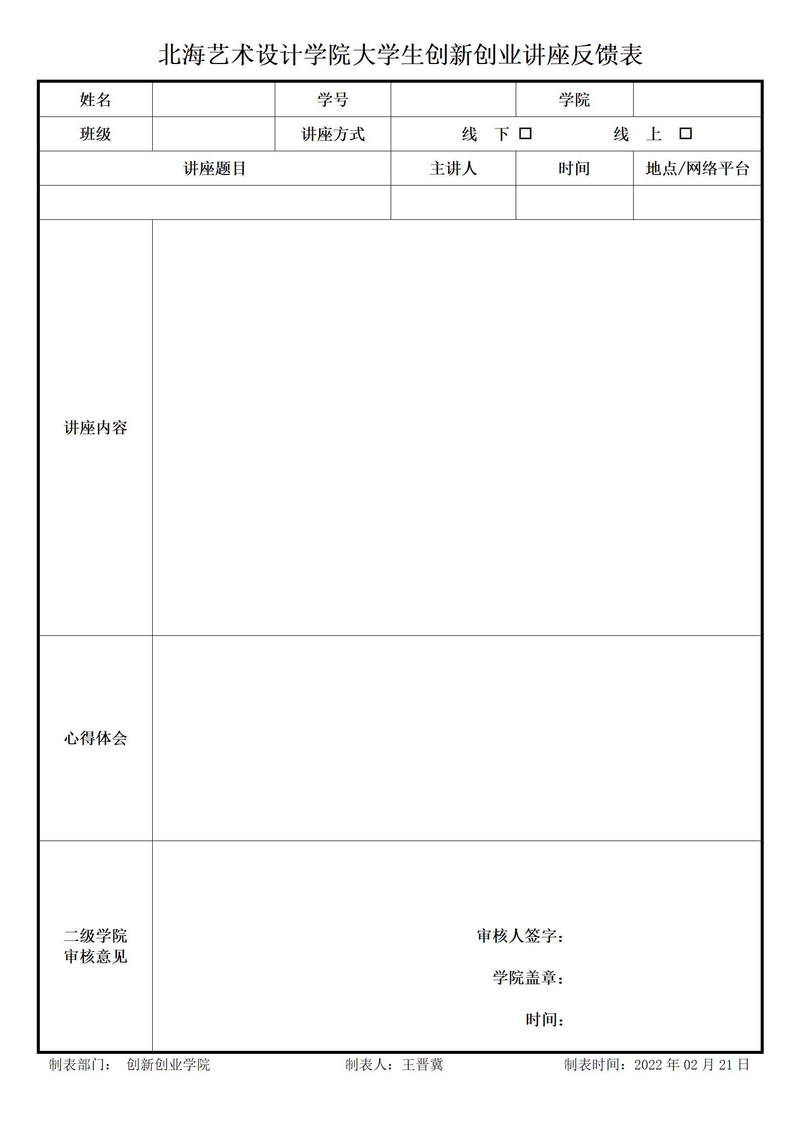 北海艺术设计学院大学生创新创业讲座反馈表