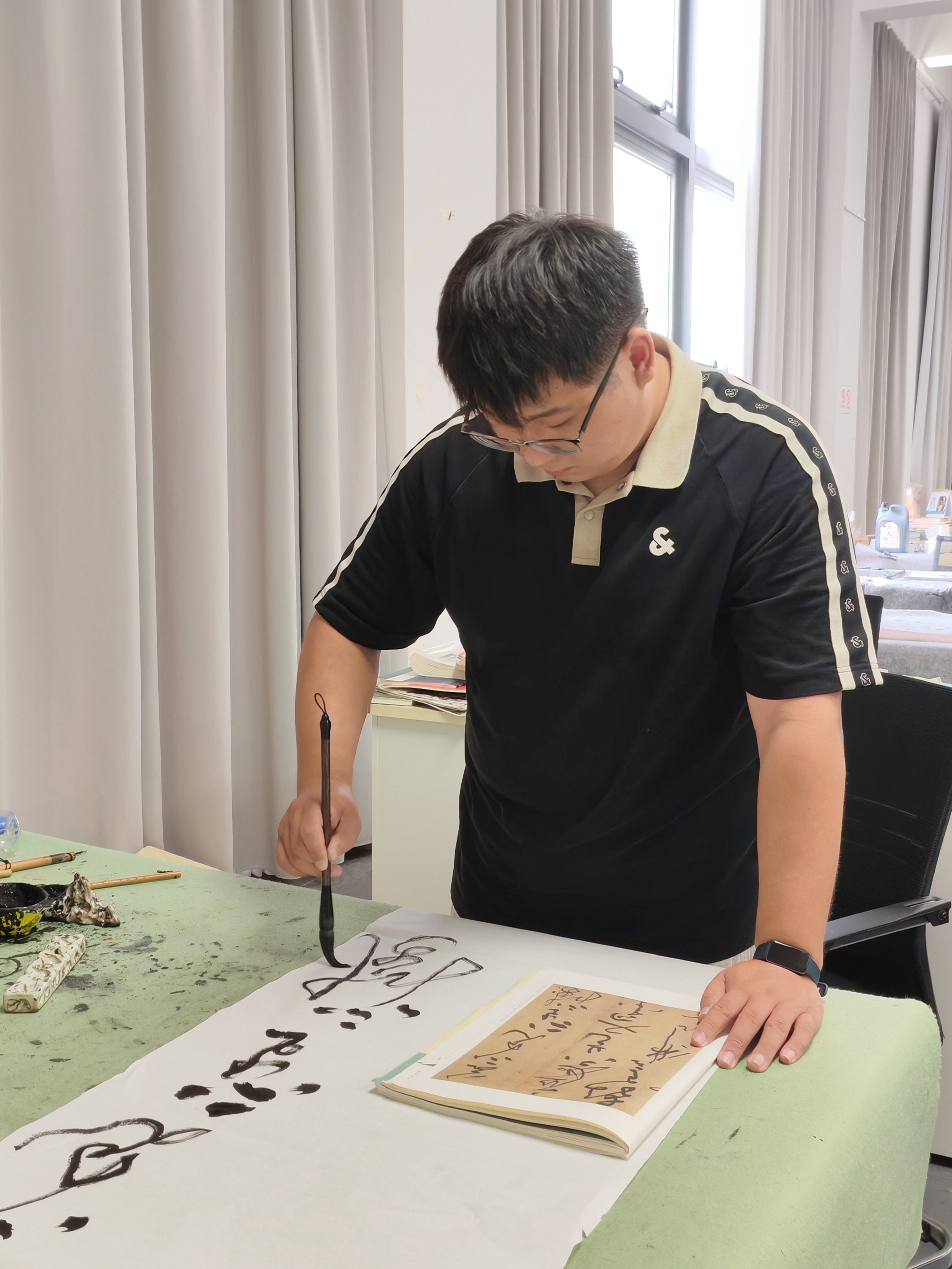 谈及学书感悟,他坦言:“越是深入临帖,越发现自己懂的太少。传统书法里有太多值得琢磨的细节,就像挖宝藏一样,每次都能有新发现。” 这番话没有华丽的辞藻,却凝结了一个大学生在笔墨实践中的真切体会——愿每位热爱书法的同学,都能在练习中保持探索的心态,书写属于自己的笔墨故事。(林芳羽 姬丁歌  摄)