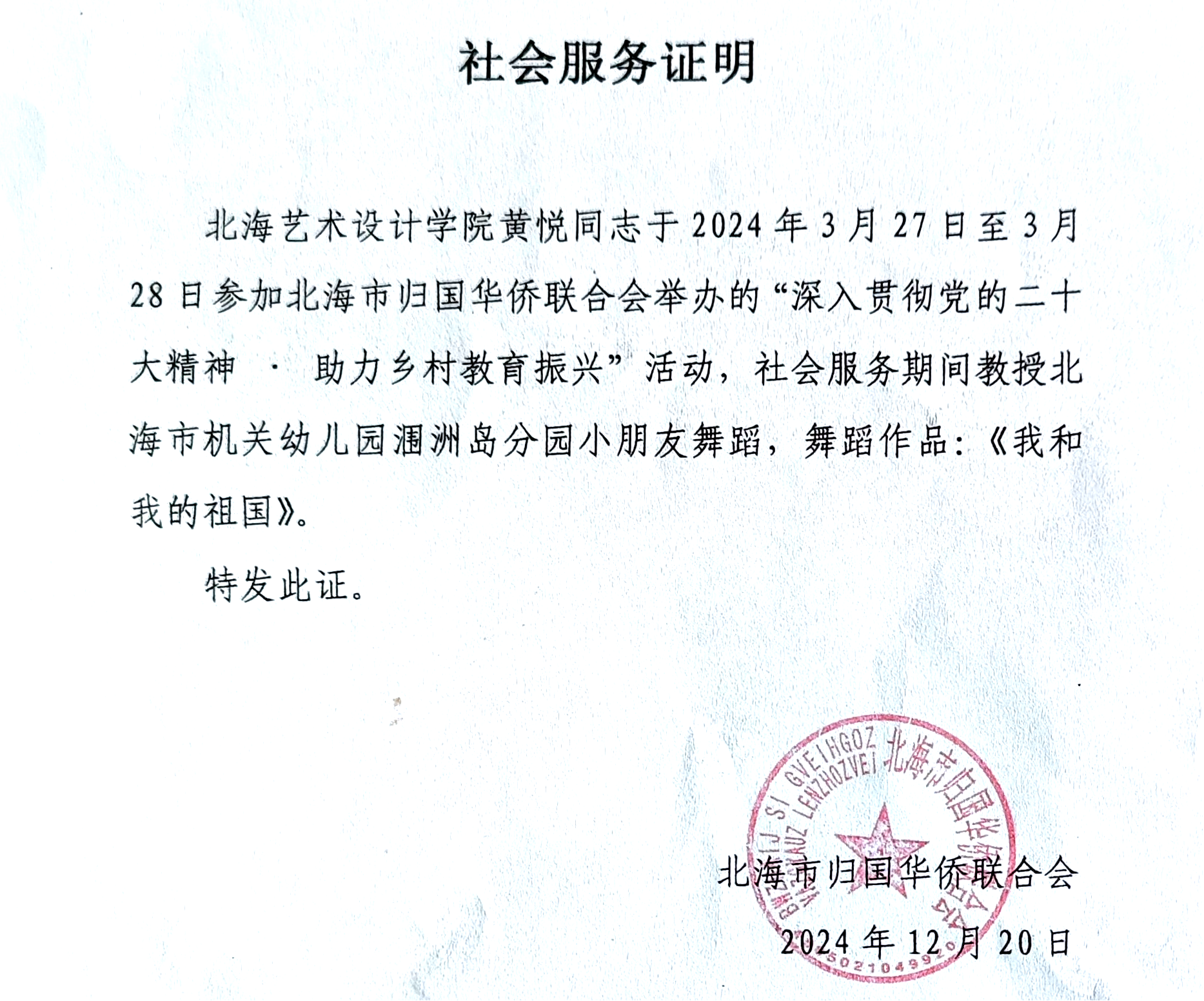 2024 年 3 月 27 日至 28 日,我校黄悦教师参与由北海市民族宗教侨务局与北海市归国华侨联合会联合举办的 “助力乡村教育振兴” 活动,以舞蹈教育赋能乡村艺术育人。她精心准备舞蹈作品《我和我的祖国》,通过生动讲解与示范,引导乡村幼儿园孩子们理解舞蹈内涵,激发爱国情怀与学习兴趣,在短时间内帮助孩子们掌握动作要领,深化对祖国历史文化的认知。