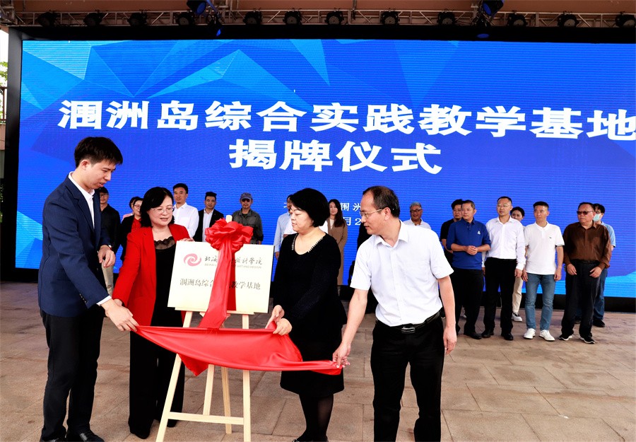 我校董事长郑念贻、涠洲岛旅游区党工委副书记沈振华代表双方进行协议签约,并与张阳、张实四人共同完成揭牌。