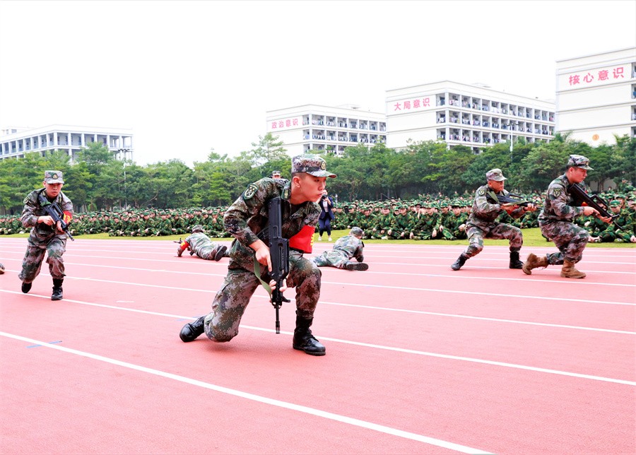 大会上,全体承训教官进行了精彩的军事科目演示,教官队伍整齐划一,步伐矫健,精神饱满,动作规范,赢得现场师生的阵阵掌声。