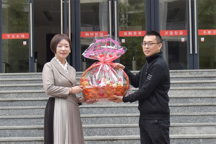 (包贤超书记向学校侨联委员赠送果篮)