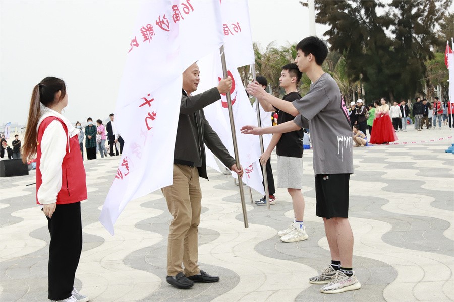 北海旅游集团有限公司副总经理李小军为沙雕代表队授旗