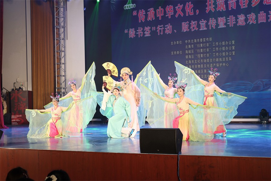 11月6日晚,以“传承中华文化 共筑青春梦想”为主题的2023年“绿书签”行动、版权宣传暨非遗戏曲进校园文艺汇演活动在北海艺术设计学院举办。