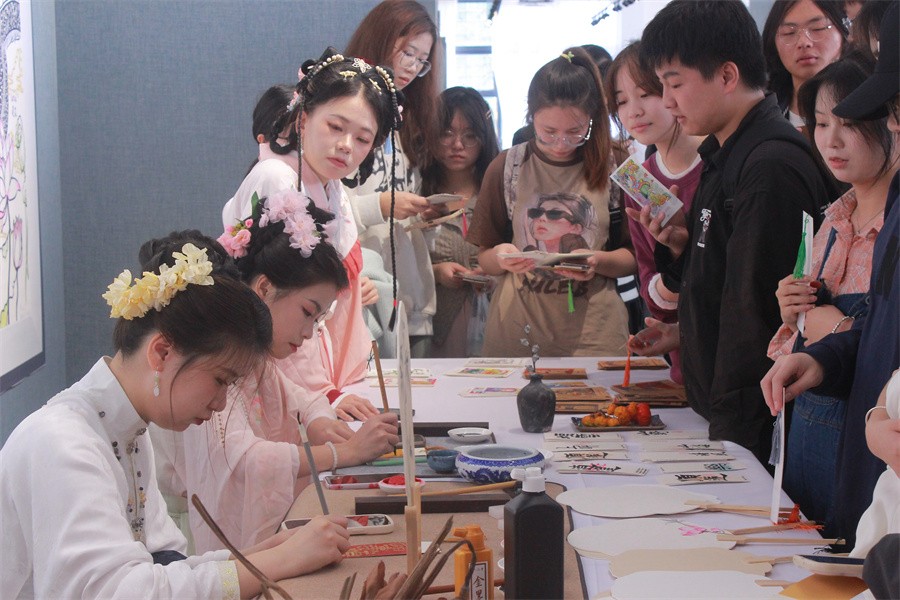 开展仪式现场安排了优秀作业入选的书法专业学生现场书写书签及明信片作为展览的纪念品赠送到场观众,受到观展师生的一致好评。