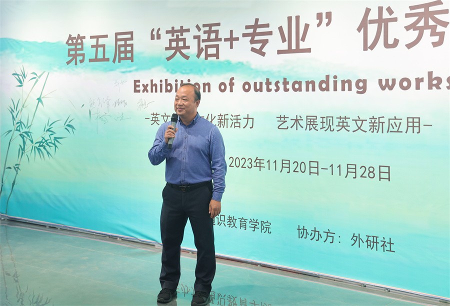 近日,由通识教育学院主办,外研社协办的第五届“英语+专业”优秀作业展于南校区艺德楼八楼顺利开展。学校党委书记范徽忠,董事长郑念贻,副校长陶立阳、邱杰出席仪式;人文教育学院院长熊秀峰,通识教育学院院长杨莹、副院长黄丹、党支部书记周斌应邀参加仪式。