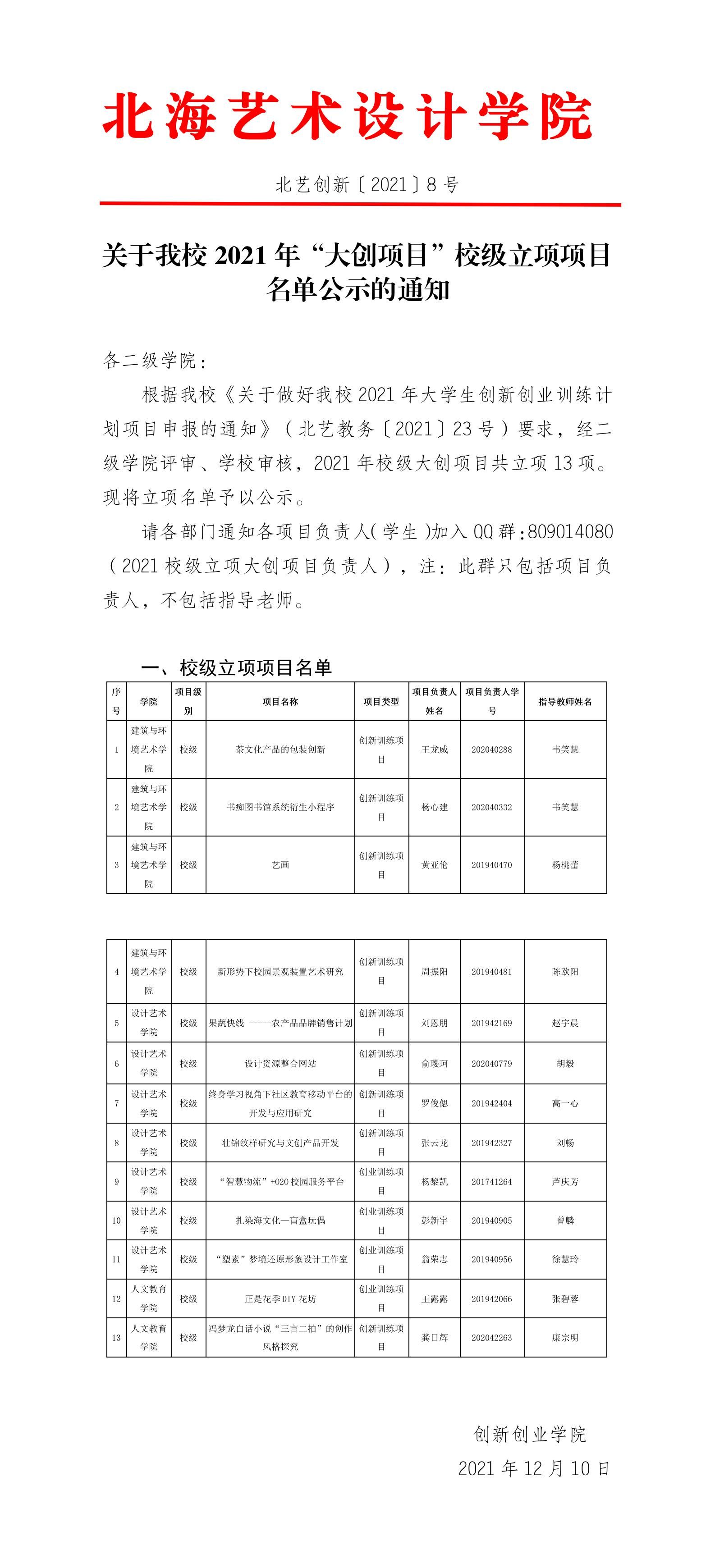 北艺创新〔2021〕8号关于我校2021年“大创项目”校级立项项目名单公示的通知