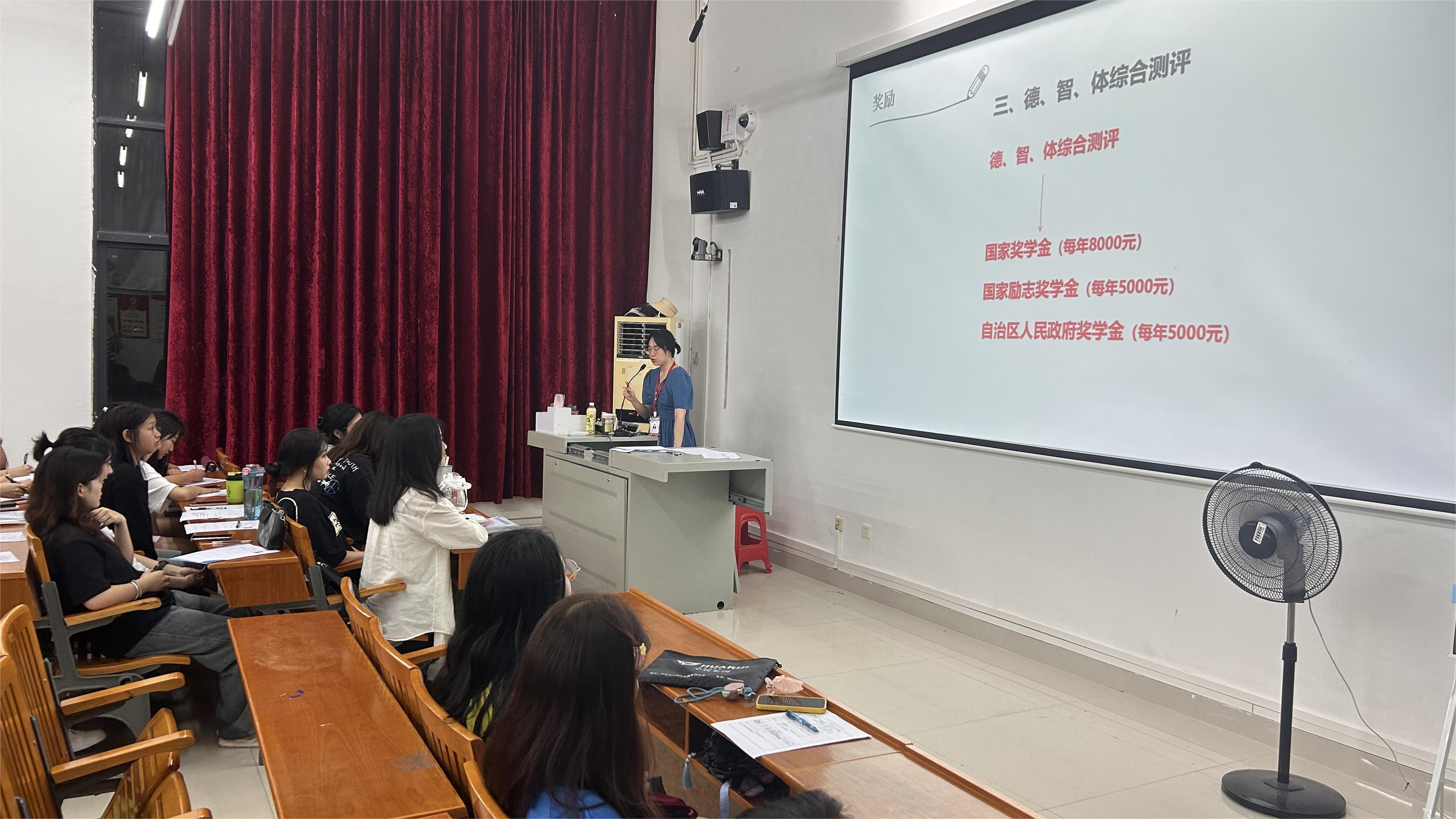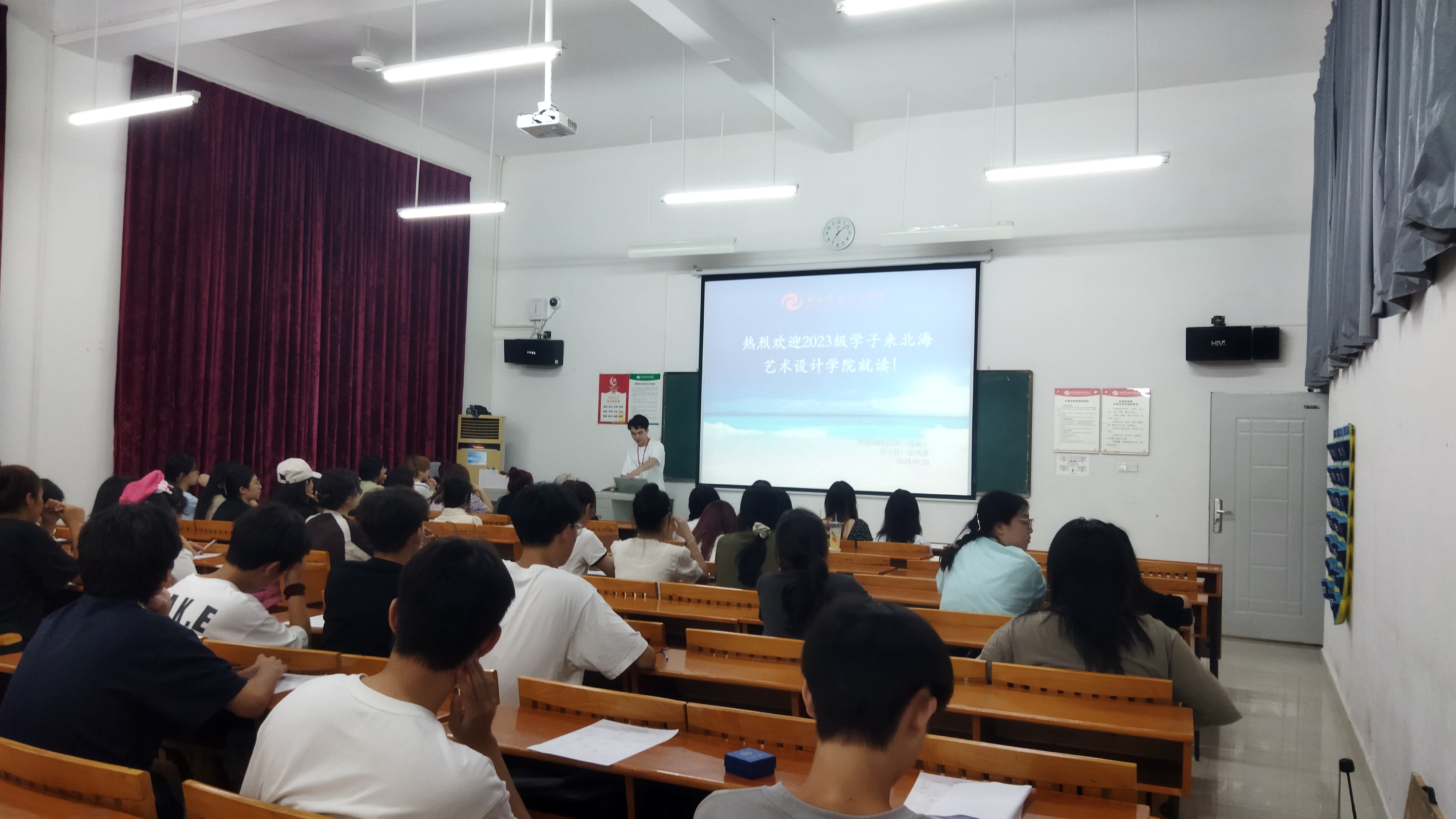 9月10日,美术学院新生辅导员为2023级各班新生举行“第一次班会”,在班会中,各班班级辅导员为新生全面介绍了北海艺术设计学院,带领新生了解美术学院的教学课程活动安排以及教学理念等。同学们对于未来的大学生活充满了憧憬,对于独立生活的困惑也向辅导员倾诉,美院各班新生辅导员耐心听取了同学们的心声,与新生进行了入学第一次交心谈话。班会上,辅导员们教导新生:要心系国家事,肩扛国家责。要度过健康积极的大学生活,担负起青年一辈肩上的责任,力求感受广阔的社会现实和伟大的时代进程,树立好“强国有我”价值导向。(许荣军 摄)