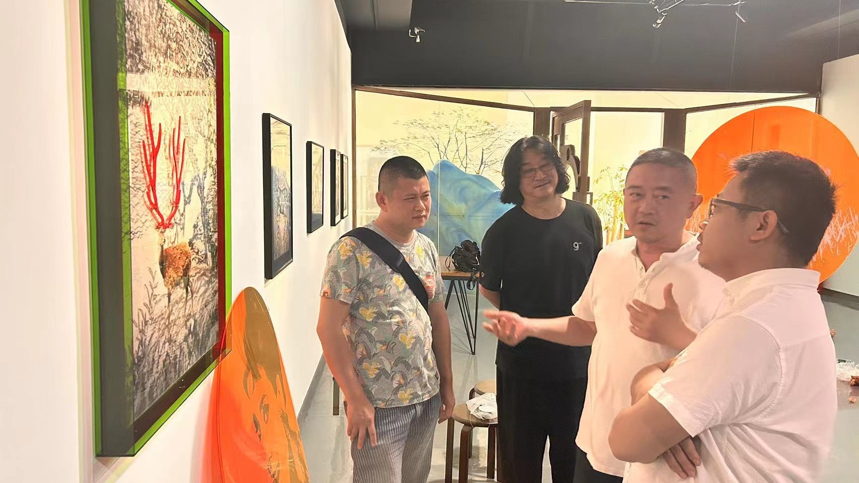 龚为院长、李炫勋主任、喻广林副主任在胡国庆主席的引导讲解下对馆内正在展出的《九月艺术馆典藏展》进行参观。龚为院长对九月艺术馆的展览体系、办馆理念、创作路径与价值取向均表示十分认同,期望以此次校企合作协议的签订作为媒介,通过人才培养、产教融合、实习就业等方面开展深入合作。
