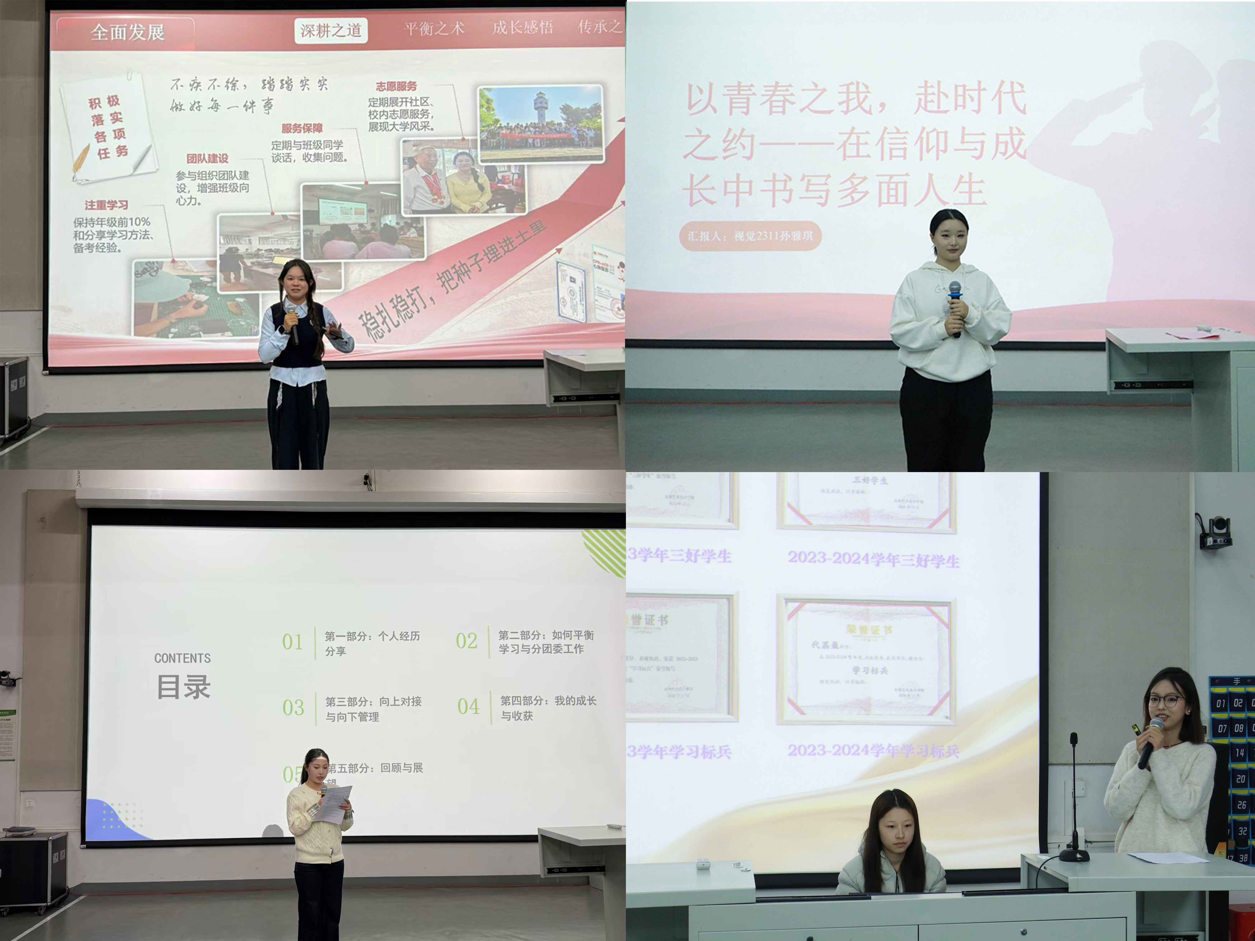 视觉2302班胡密雪从大学生创新创业切入,系统介绍了项目推进的关键环节与实践心得;视觉2305班马思睿作为学生干部代表,以时间管理为主线,分享如何平衡学业与工作;视觉2311班孙雅琪结合入党历程,讲述自身在思想提升与学业进步方面的双重成长,鼓励同学们树立信念、积极向党组织靠拢;视觉2225班代荔盈聚焦设计竞赛,从选题构思、作品创作到备赛技巧,层层深入,并强调竞赛对专业能力提升的重要价值。