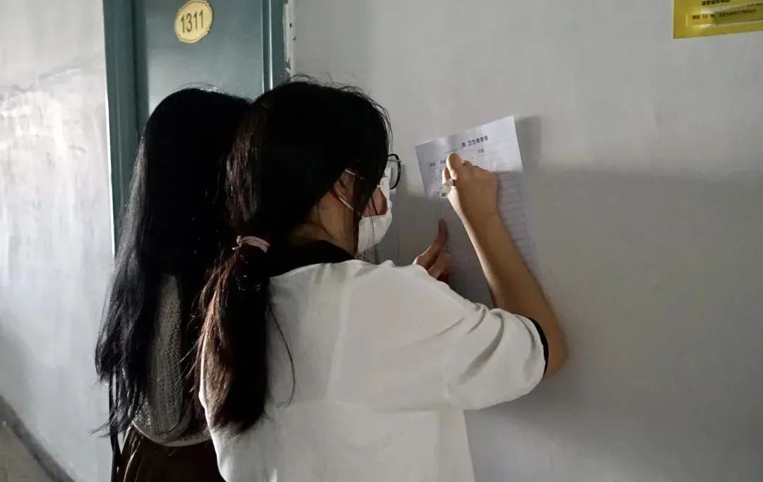 在宿管阿姨的带领下各部门学生干部进入宿舍进行随机抽查评比,检查过程中干部们都在认真的执行检查工作。