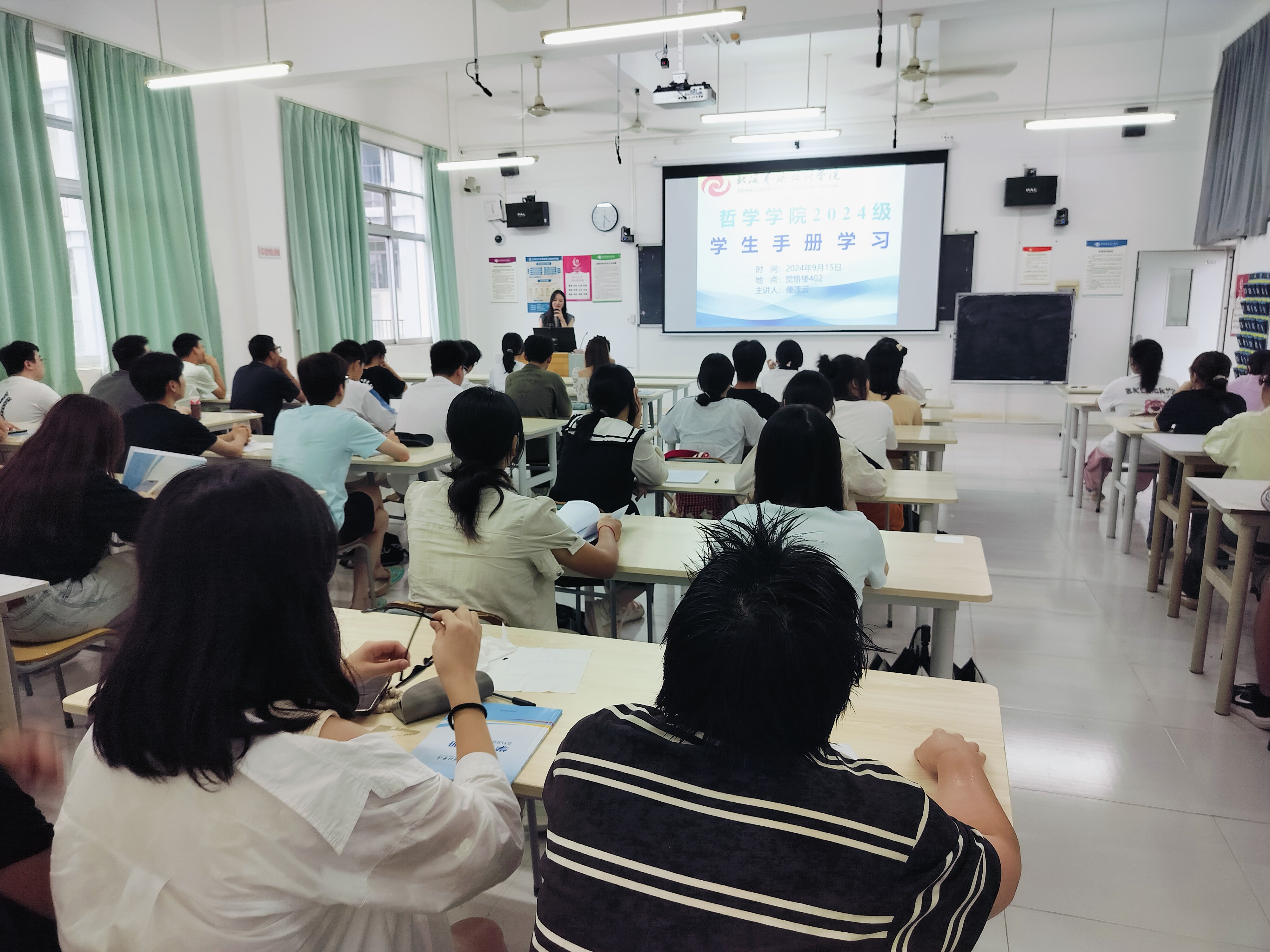 (俸莲云老师带领新生学习《学生手册》)
