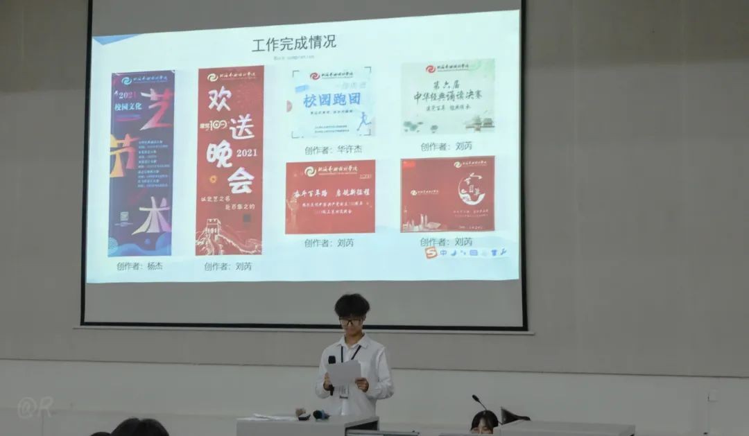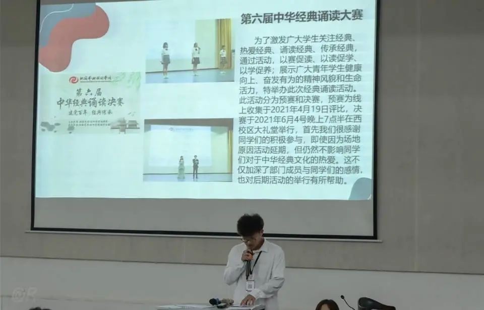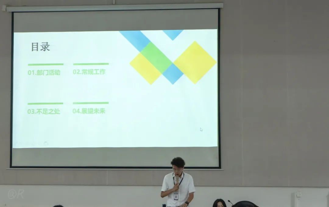 外联实践部成员王镜然主讲本学期部门工作总结。从各个方面对本学期部门负责的一系列工作做了回顾总结,并表示在接下来工作的过程中汲取教训,予以改正,以最饱满的热情以及认真的态度投入到往后的工作中去。