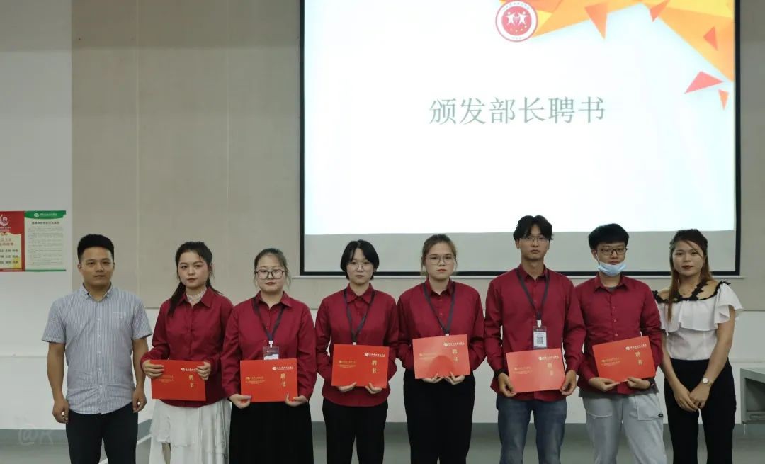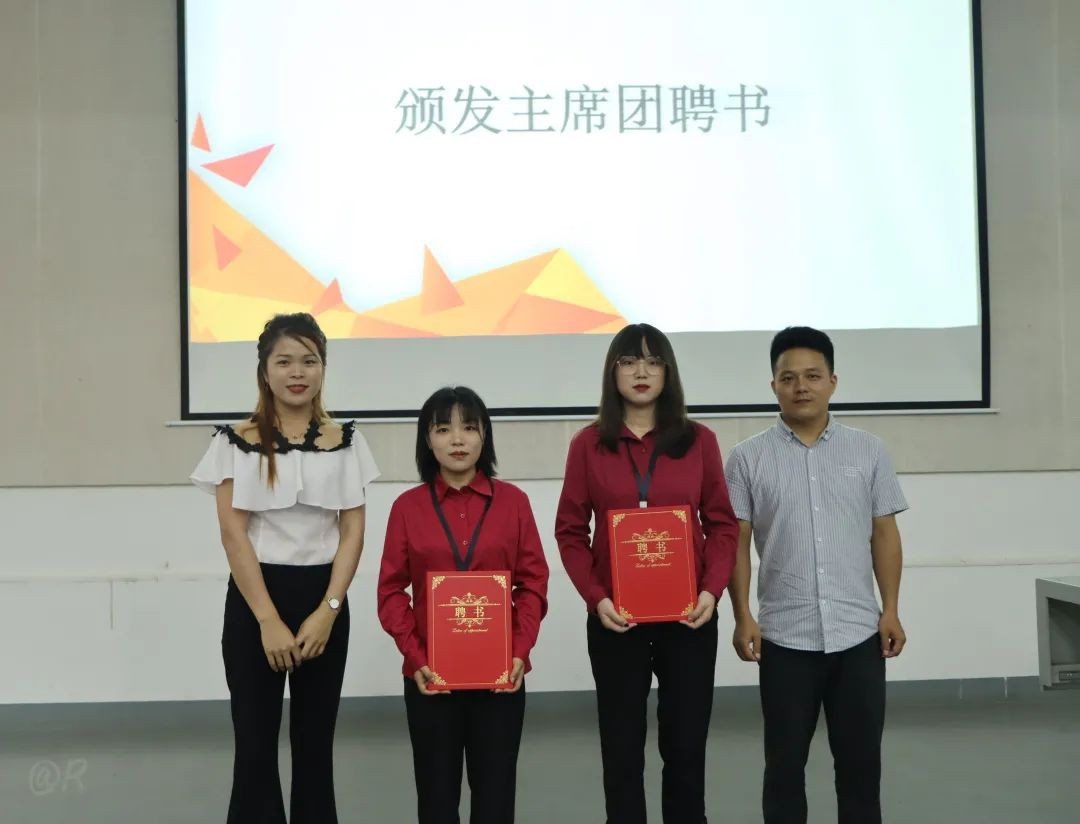 会议第四项,由团委书记唐良春和团委副书记宋慧敏给各部门部长颁发聘书。