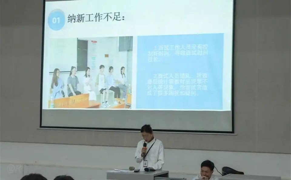 纪检部成员夏顺主讲本学期部门的工作总结。首先对本学期部门的工作及不足之处进行总结,提出部门凝聚力不足等问题,并表示在接下来的工作中对不足之处进行改进。