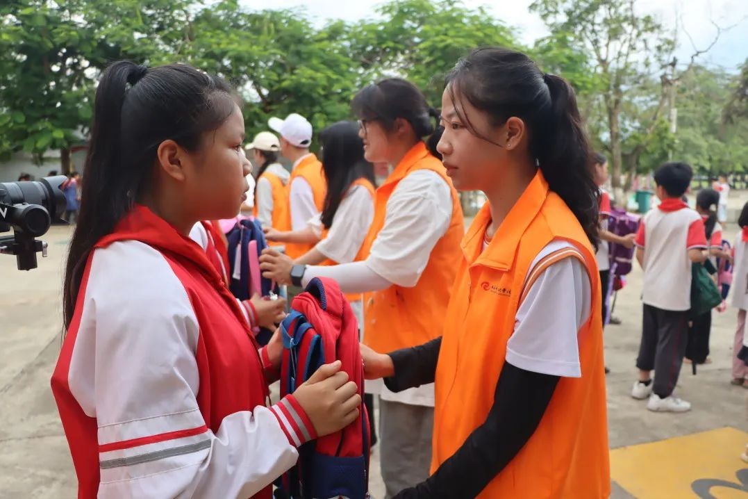 接着,践行团的成员们为小朋友们送上学习物品,并和孩子们深入交流,询问他们的日常生活和学习基本情况,以及当地的民族文化。