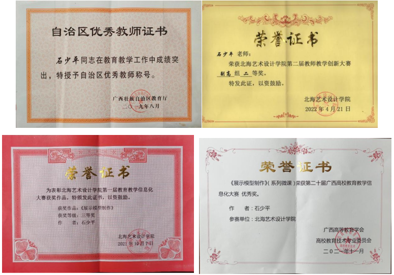 加强学习、紧跟学术前沿。在完成繁重的教科研工作之余,石少平老师积极参加各级赛事,提升个人教学水平,在2019年荣获广西壮族自治区优秀教师称号;2019年参加全区第六届青年教师教学竞赛并荣获校赛一等奖、区赛工科组优秀奖;2021年第二十届广西高校教育教学信息化大赛《展示模型制作》荣获优秀奖,校赛三等奖;2022年获广西第二届高校教师教学创新大赛校赛副高组二等奖并推送区赛;2022年获北海艺术设计学院第三届高校教师教学创新大赛校赛一等奖。