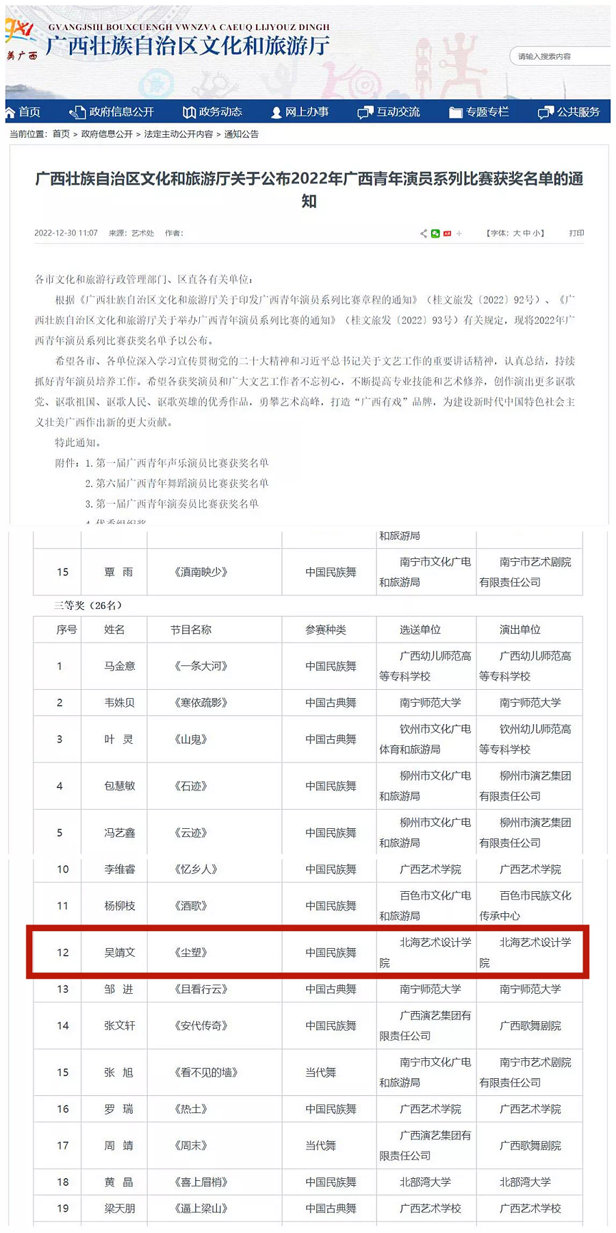由自治区文化和旅游厅主办,广西文化产业集团有限公司承办的第六届广西青年舞蹈演员比赛决赛于2022年12月3日至12月8日在南宁民族大剧院开赛。我校两名舞蹈表演专业学生吴靖文和赖德彬从全区各级专业院团、艺术院校等88家单位、436个舞蹈作品、218名舞蹈演员中脱颖而出,成功进入决赛。其中学生吴靖文在决赛中取得了三等奖的优异成绩。