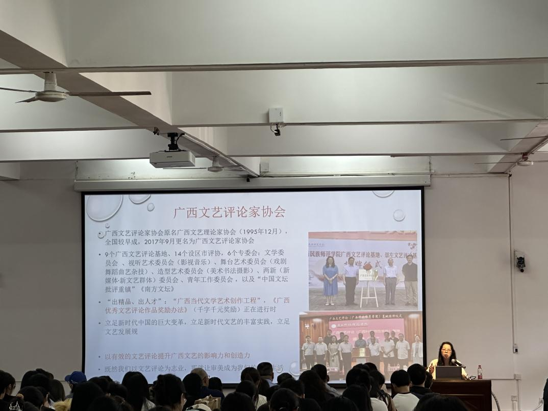 张主席还谈到了文艺批评有效性的问题。她表示,有效的批评,是批评家是否有艺术良知与担当精神的一个标志。文艺批评要讲真话、讲道理、有时代担当。讲座中,张主席还对当下以有效的文艺评论提升广西文艺的影响力和创造力做出了建议。认为应当关注广西文艺品牌,如文学桂军、漓江画派、八桂书风,应当建立广西文艺评论基地,并建议北海市和我校搭建完善的评论基地,以此锻炼学生的文学感受力和鉴赏力,提升广西文艺的影响力。
