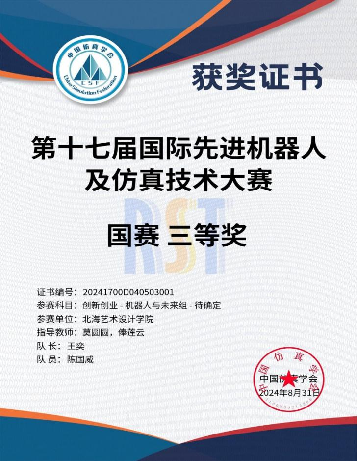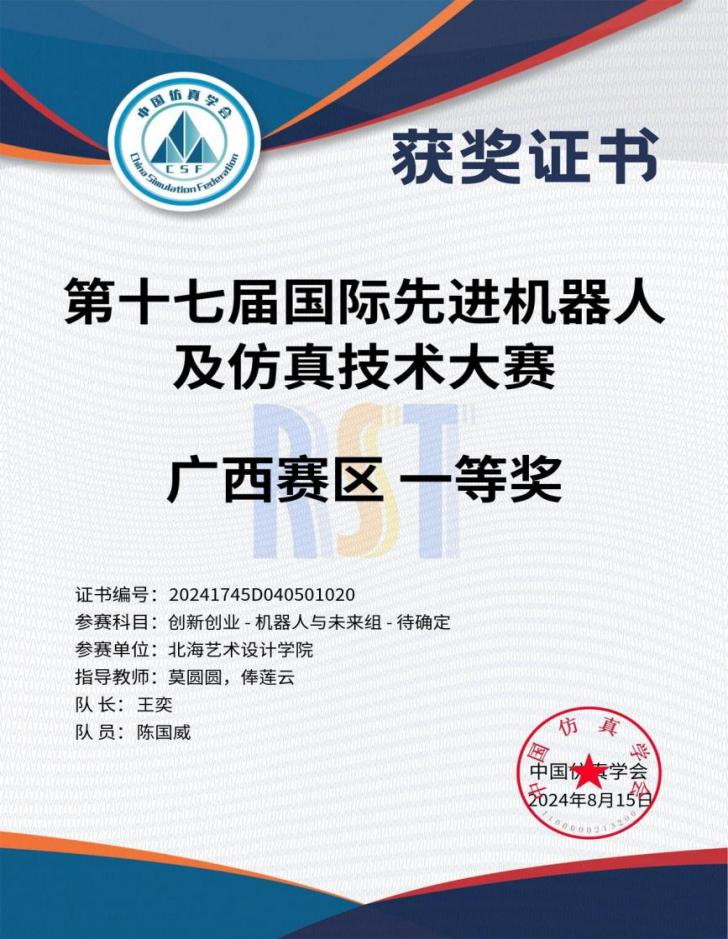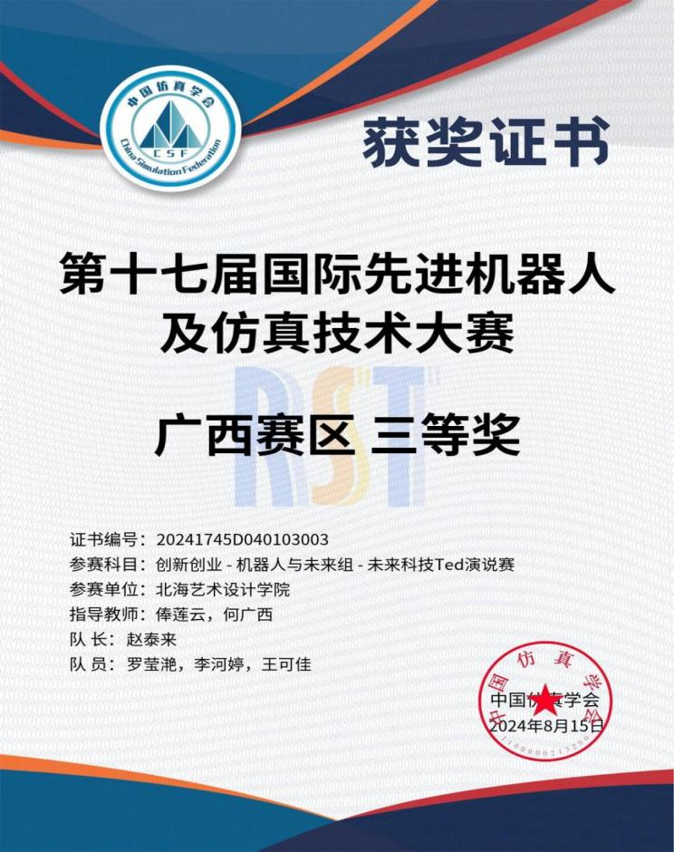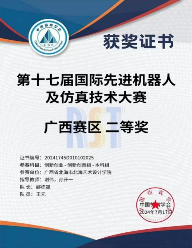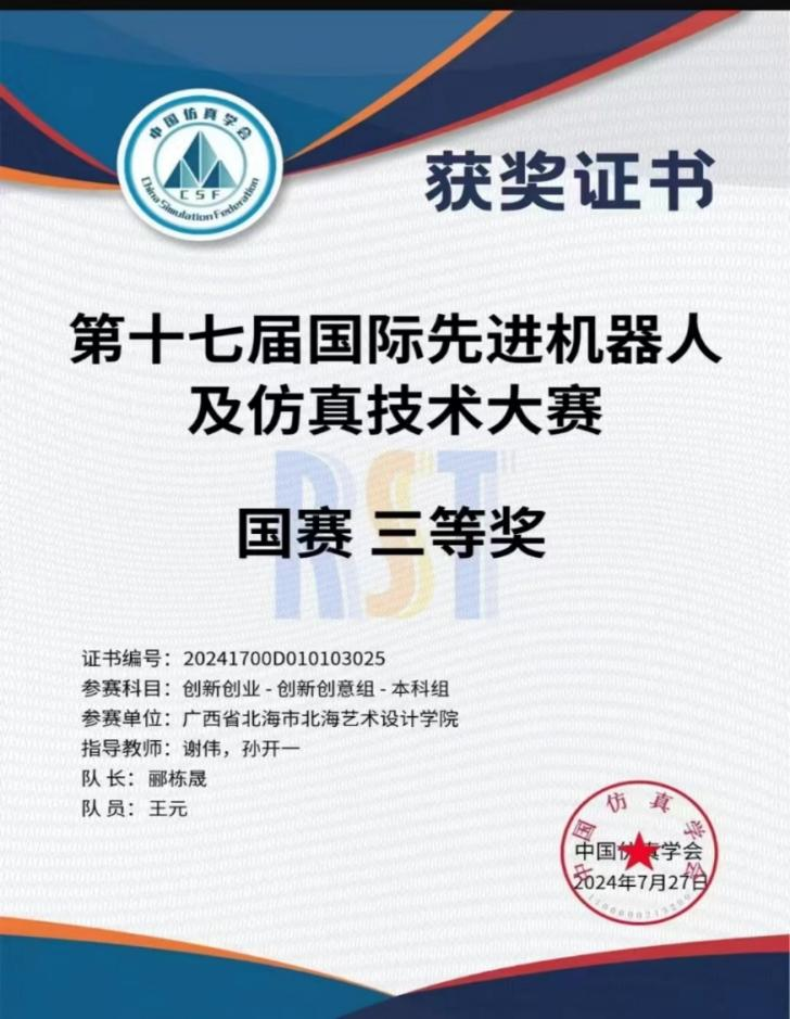 20248,由中国仿真学会及中国软件科学院研究所联合主办,中国仿真学会机器人系统仿真专委会北京博雅融合教育与科技中心承办2024年第十届国际先进机器人及仿真技术大赛在江苏南通圆满落幕在此次高规格、高难度的比赛中,由哲学学院罗莹滟、赵泰来、王元等同学组成的代表队,在哲学学院谢伟、俸莲云、孙开一等老师的指导下,取得国赛三等奖两项,广西赛区一等奖一项、二等奖一项、三等奖三项的优异成绩。同时,特别恭贺文学院、动画与传媒学院郦栋晟、朱梦茹、王静涛、李晓宏、王若梅、徐梦璐、王奕、陈国威等同学,并在此对何广西、莫圆圆等老师的倾力帮助表示诚挚的感谢。