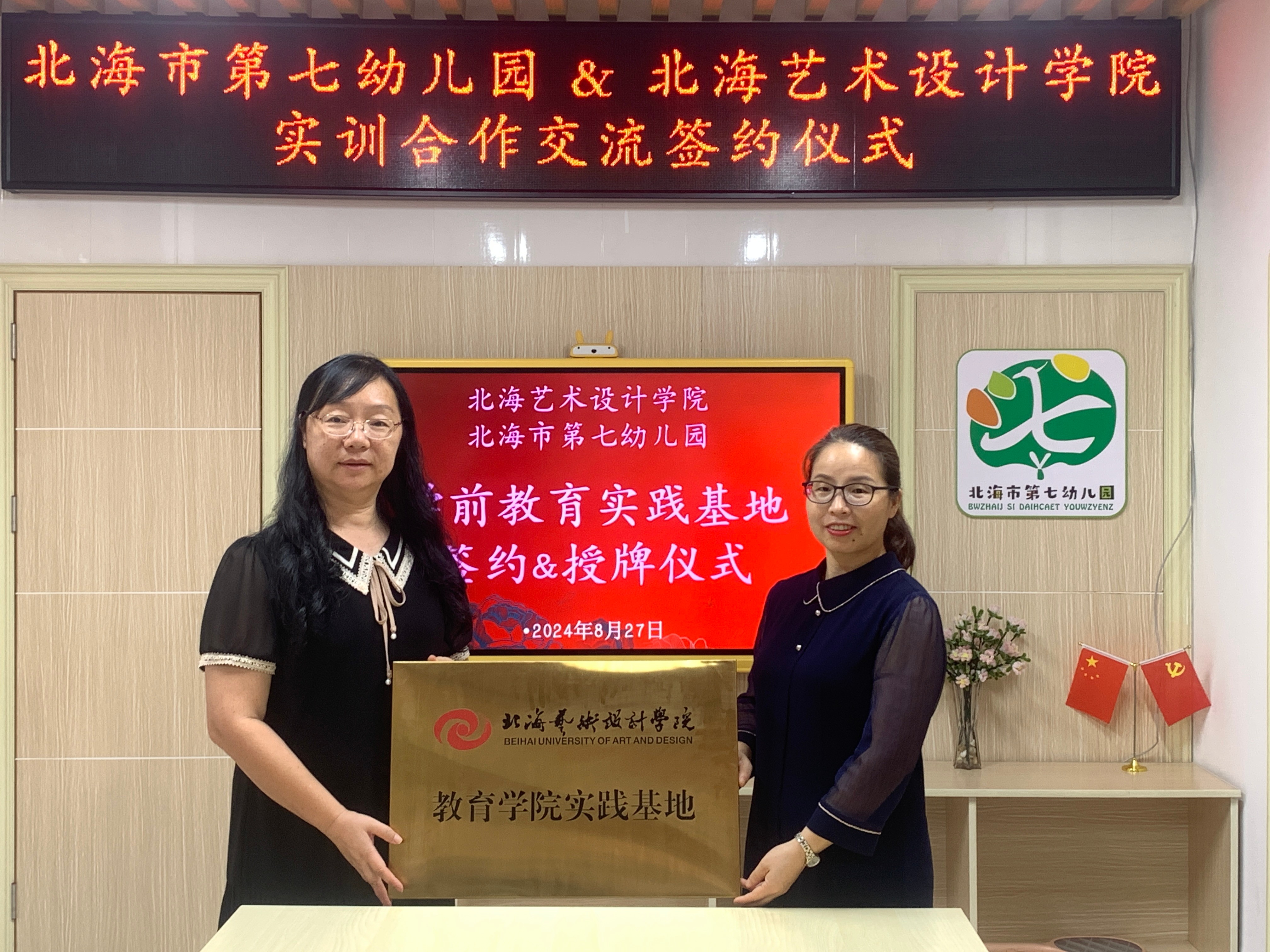 2024年9月27日,北海艺术设计学院教育学院与北海市第七幼儿园实训合作交流暨实践基地签约授牌仪式在北海市第七幼儿园启动。教育学院院长熊秀峰、实验室主任冯小霞、教务办主任黄海林、学前教育教研室主任覃思、市第七幼儿园党支部书记、园长张铮、副园长张均霞、办公室副主任邹华婷等出席仪式。基于“资源共享,优势互补”的思想指导下,贯彻落实我院OBE人才培训理念,深化产教融合,有效推进教学和科研工作的深度合作与交流,实现协同育人,提升高素质复合应用型人才培养质量。