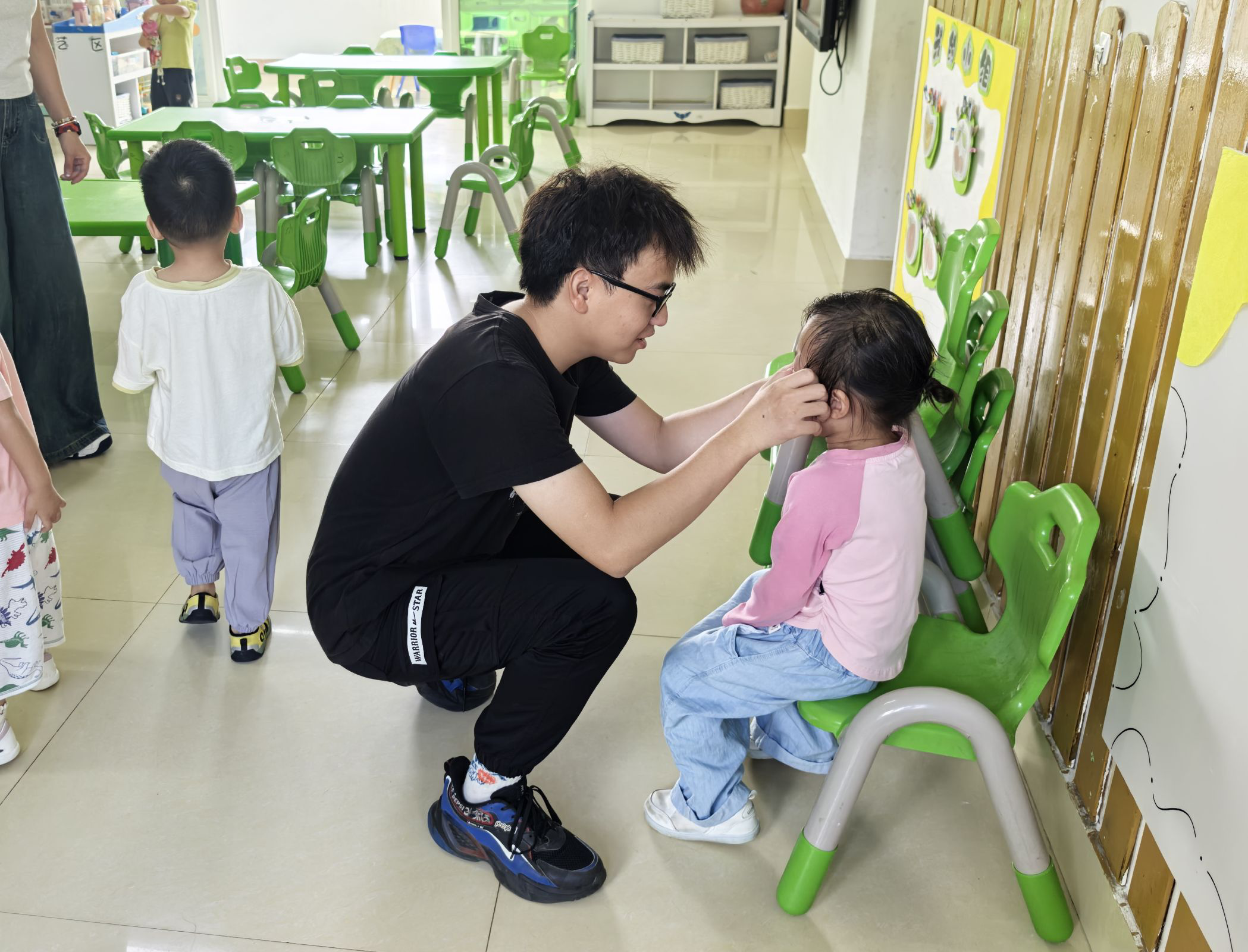学前2401陈雅萱(左)陈婷婷(右)给幼儿扎头发