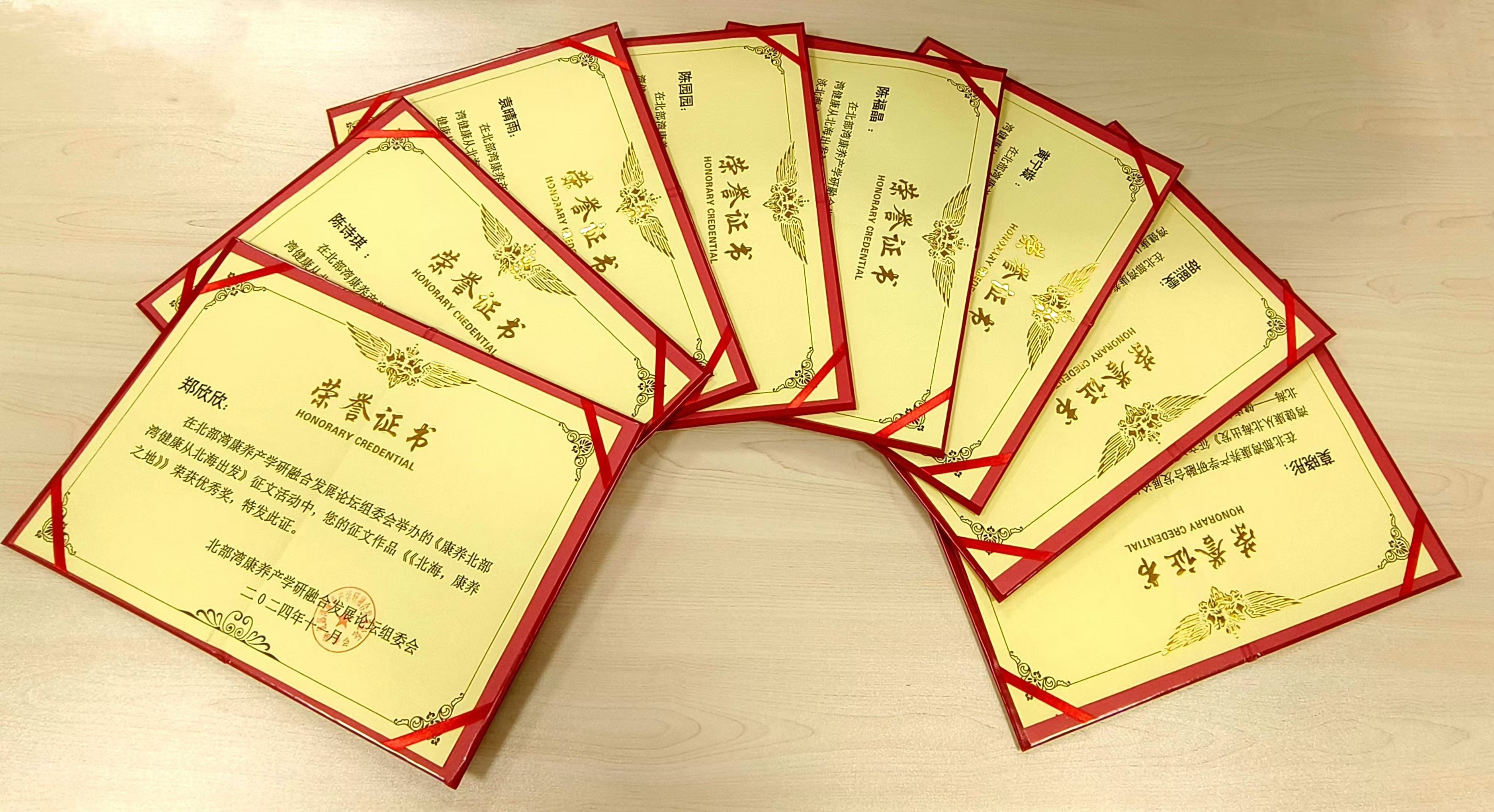 此外,我院学生莫晓彤、胡熙雯、黄宁璇、陈福晶、陈诗琪、袁晴雨、陈园园、郑欣欣8名学生荣获了优秀奖。这些作品既有对北部湾康养资源的深入挖掘,展现了北部湾地区的康养魅力,也有对健康养生理念的独特见解,体现了我院青年学子对北海市康养文化的深刻思考和创意表达。