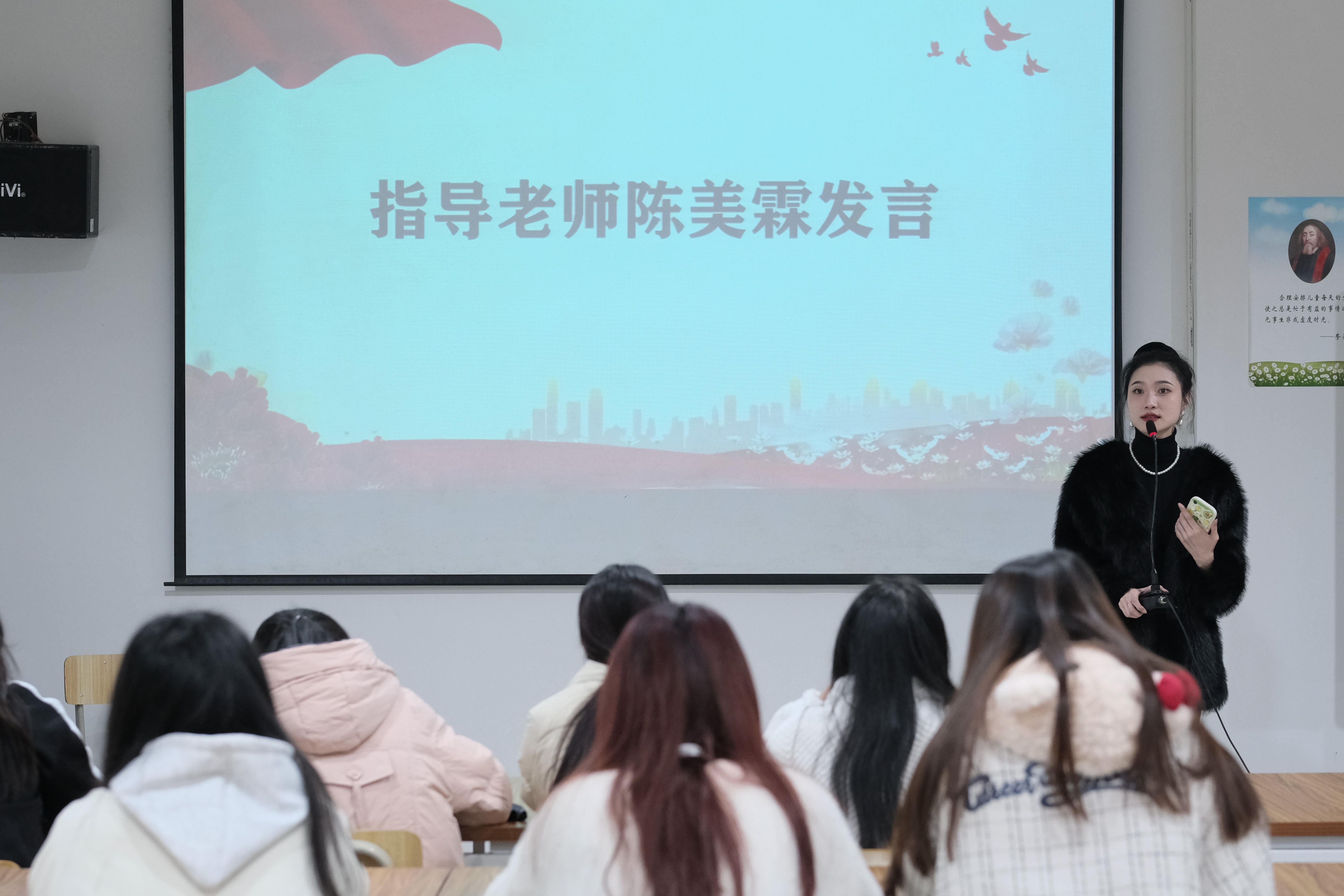 紧接着,陈美霖老师发表讲话。她教育学院团总支这一学期的辛勤付出和取得的成绩给予了肯定。同时,她指出目前团总支工作中存在的问题与不足,并给出了具体的整改建议。